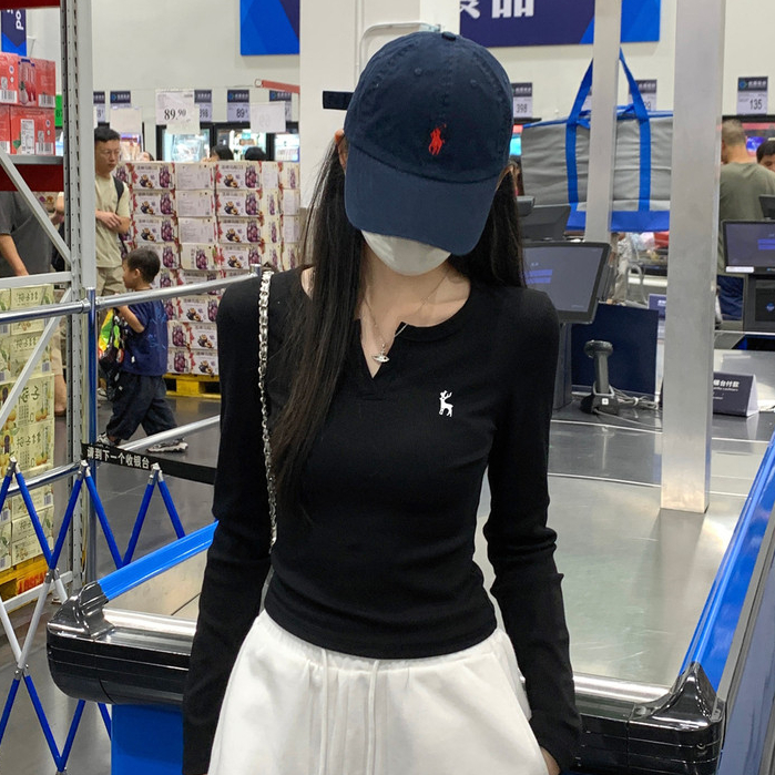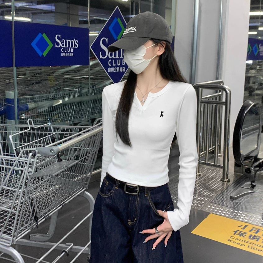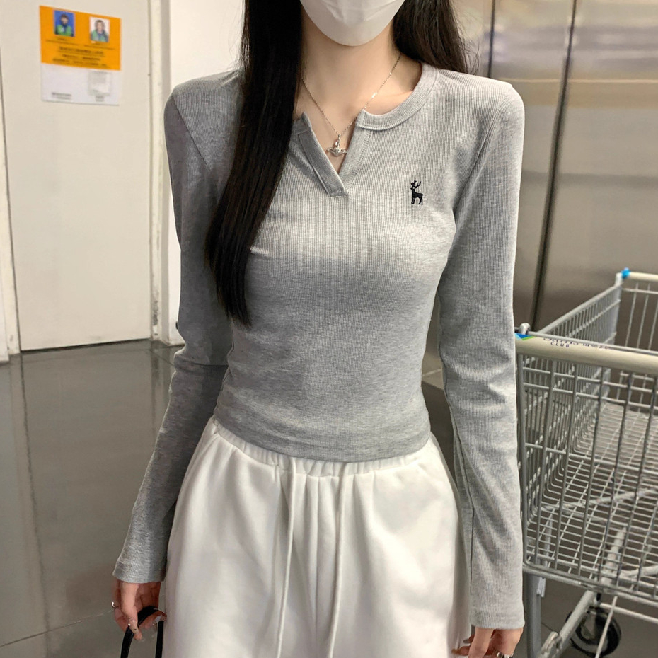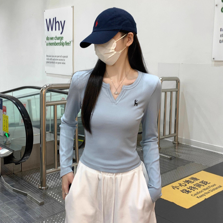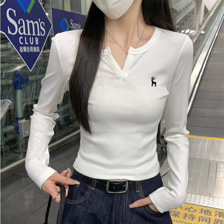 【WJZ】Korean Fashion Women's Embroidered Half-Open Collar Slim Fit Long Sleeve T-shirt【7835】