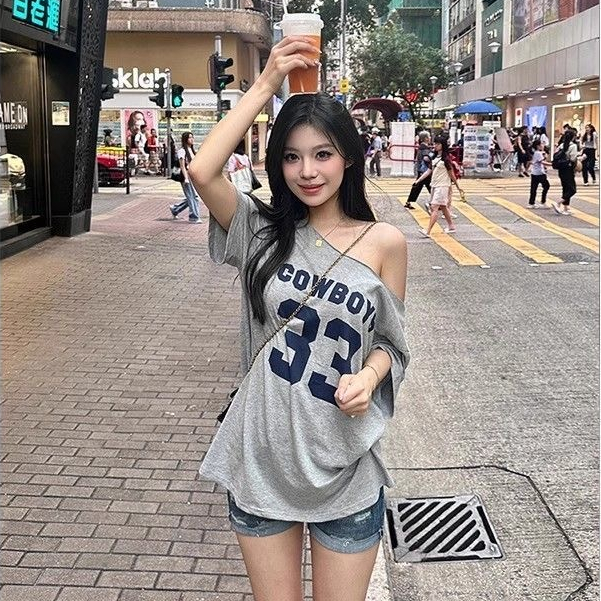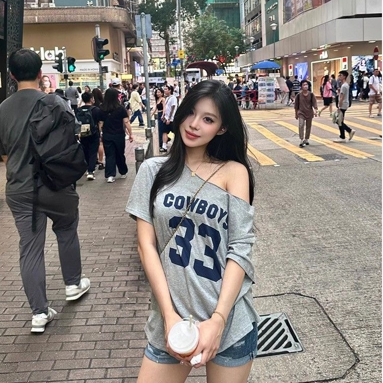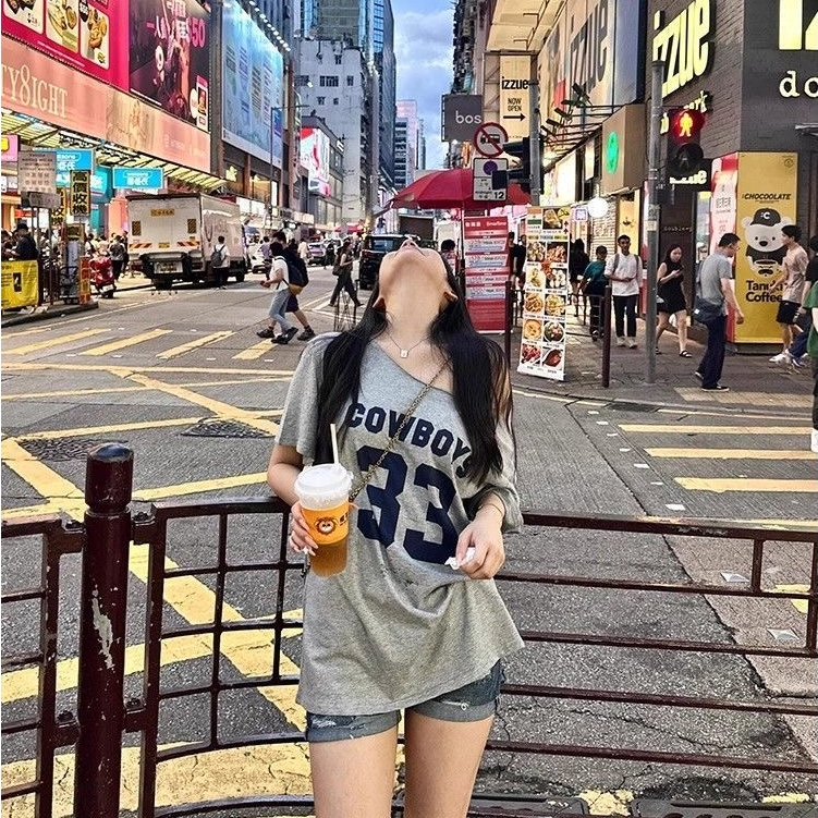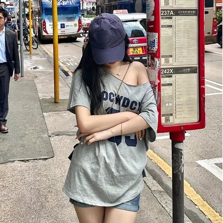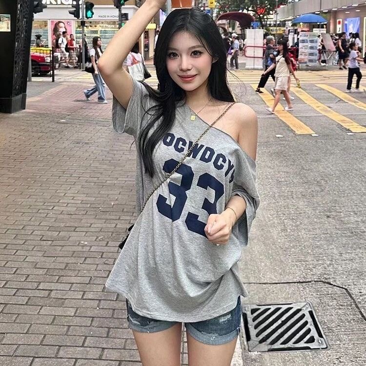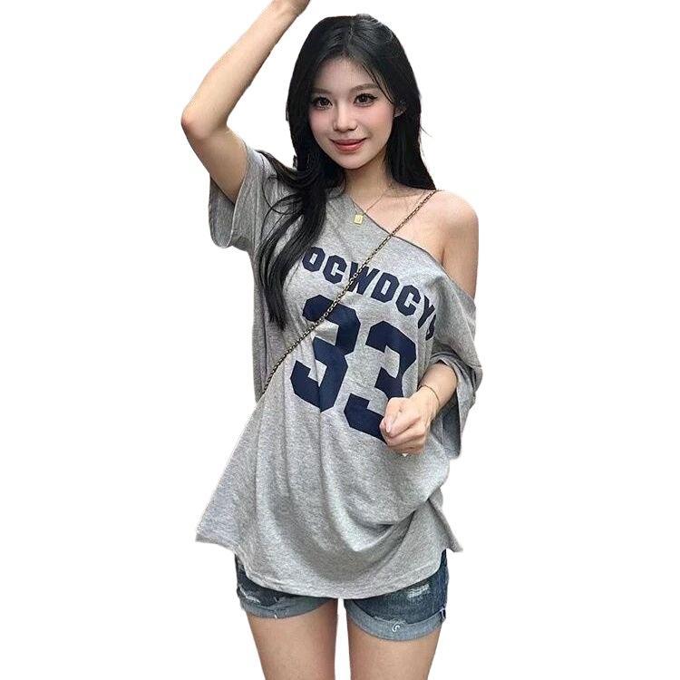 【WJZ】Women's Korean Fashion Loose Sexy Off-shoulder Letter Printed Short Sleeve T-shirt【T72】