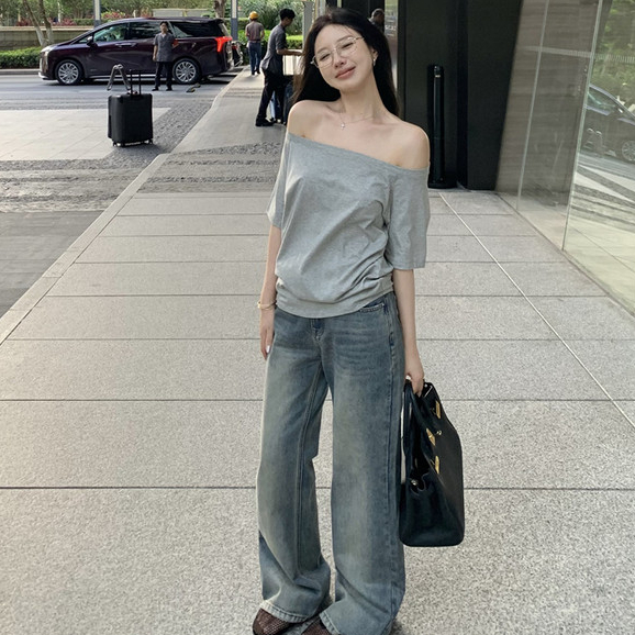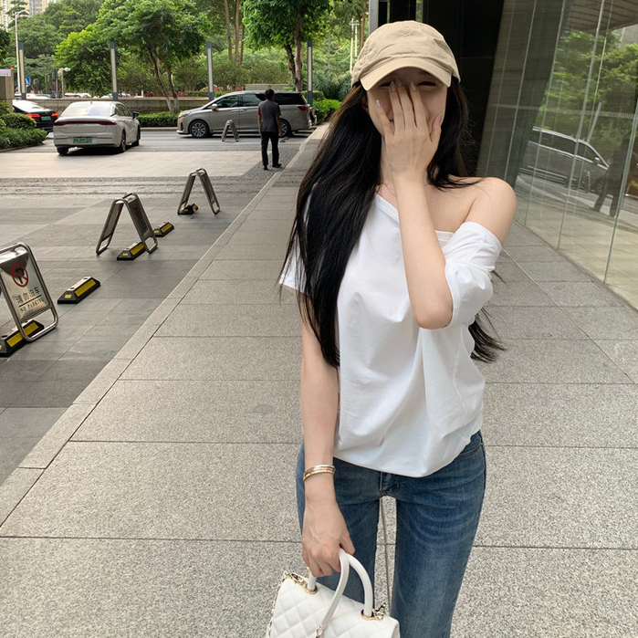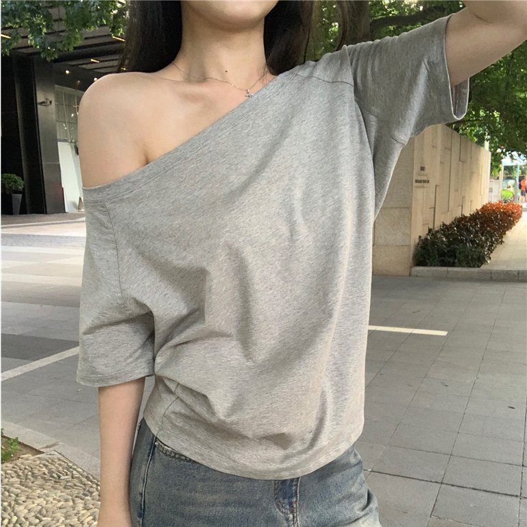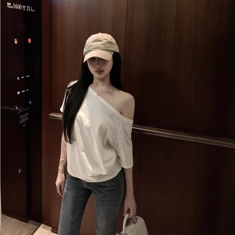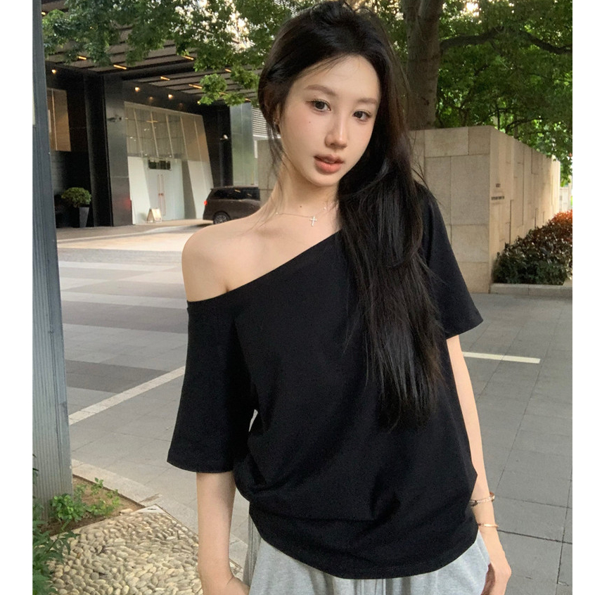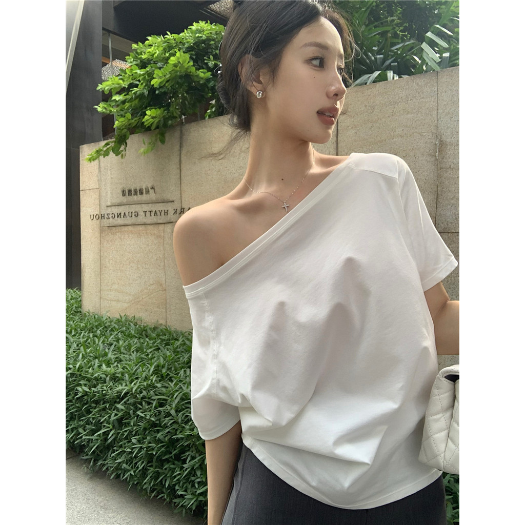【WJZ】Women's Korean Fashion Off-shoulder Design Loose Short-sleeved T-shirt【B6】