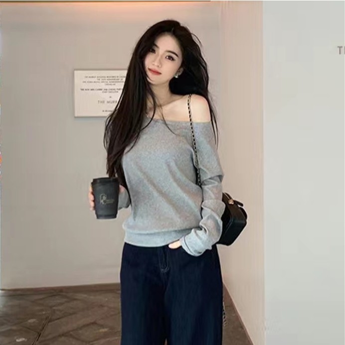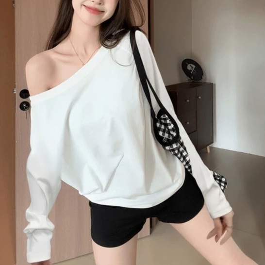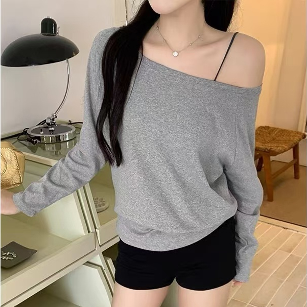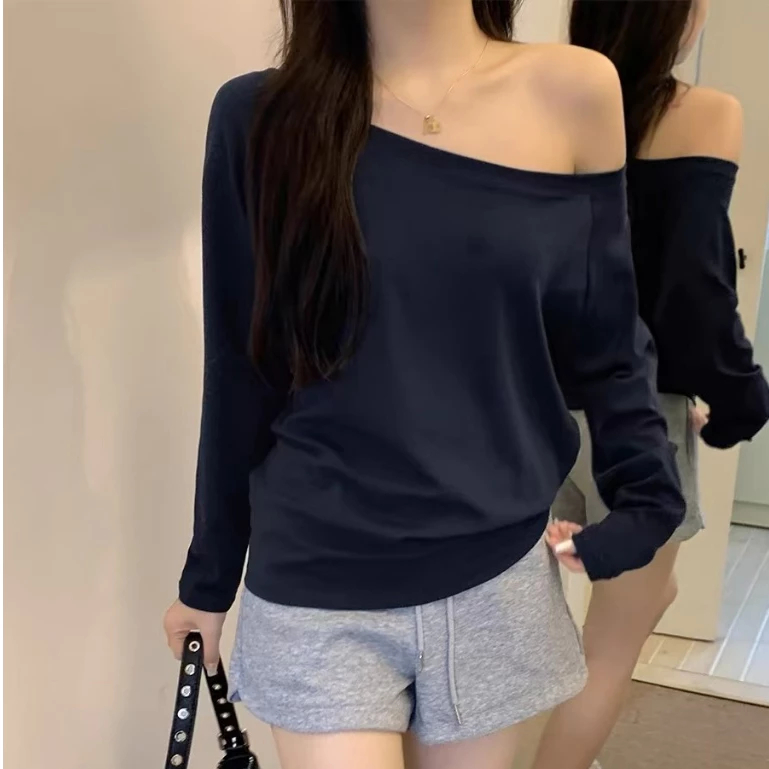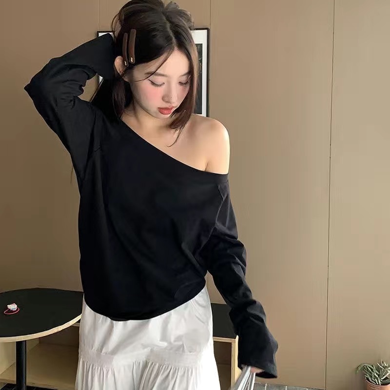 【WJZ】Women's Korean Fashion Solid Color Loose Off-shoulder Design Sexy Long Sleeve T-shirt【6958】