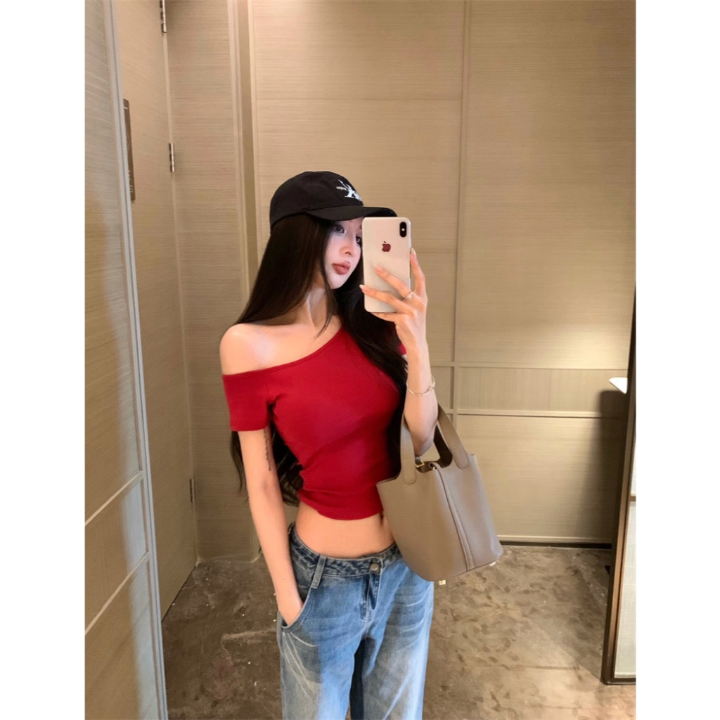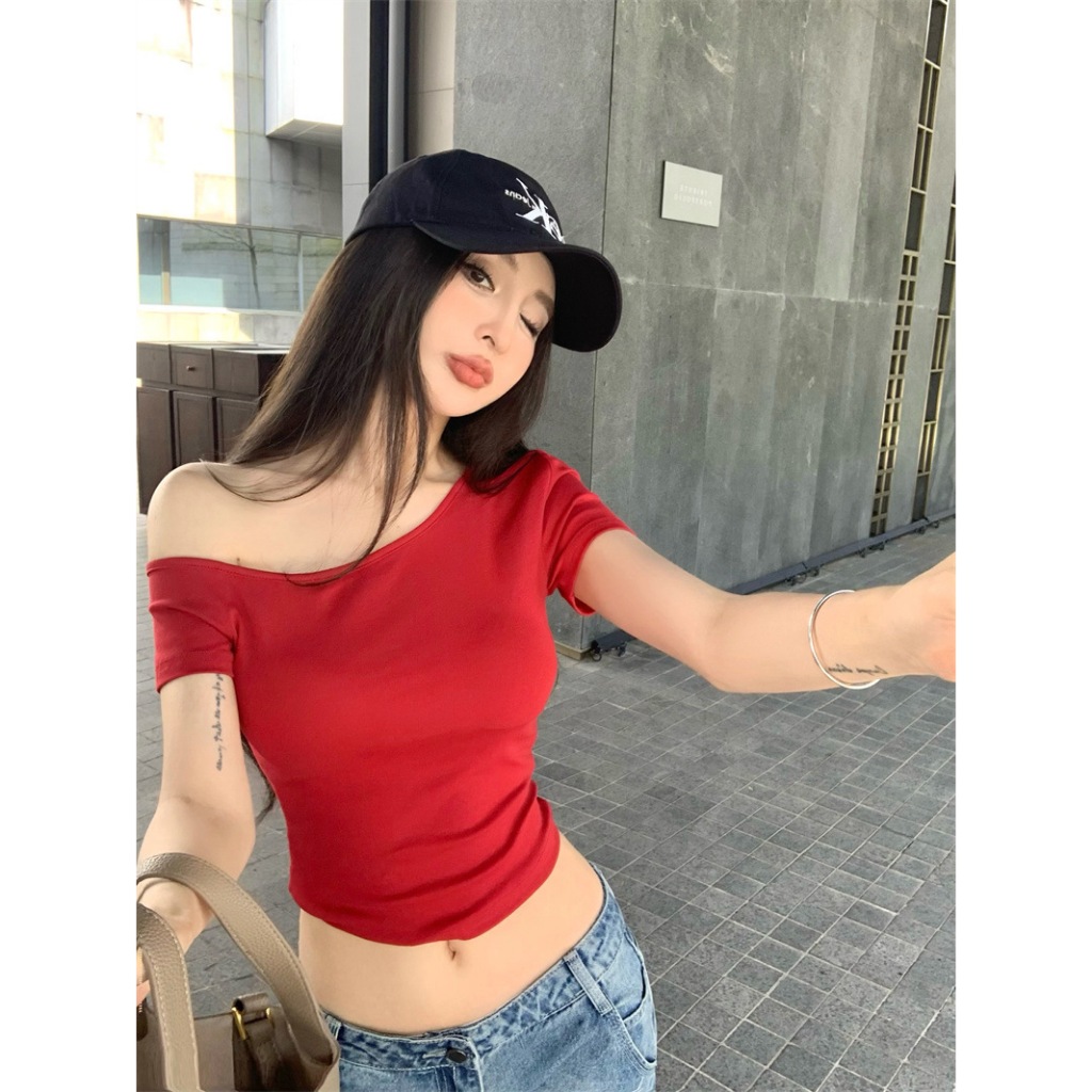 【WJZ】Women's Korean Fashion Solid Color Off-shoulder Design Short Sleeve T-shirt 【T68】