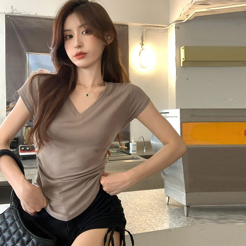【WJZ】Women's Korean Fashion V-neck Solid Color Cotton Short Sleeve T-shirt【9901】