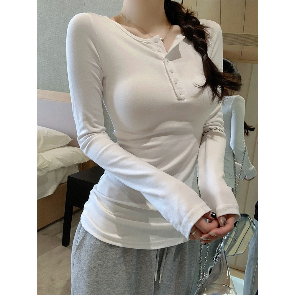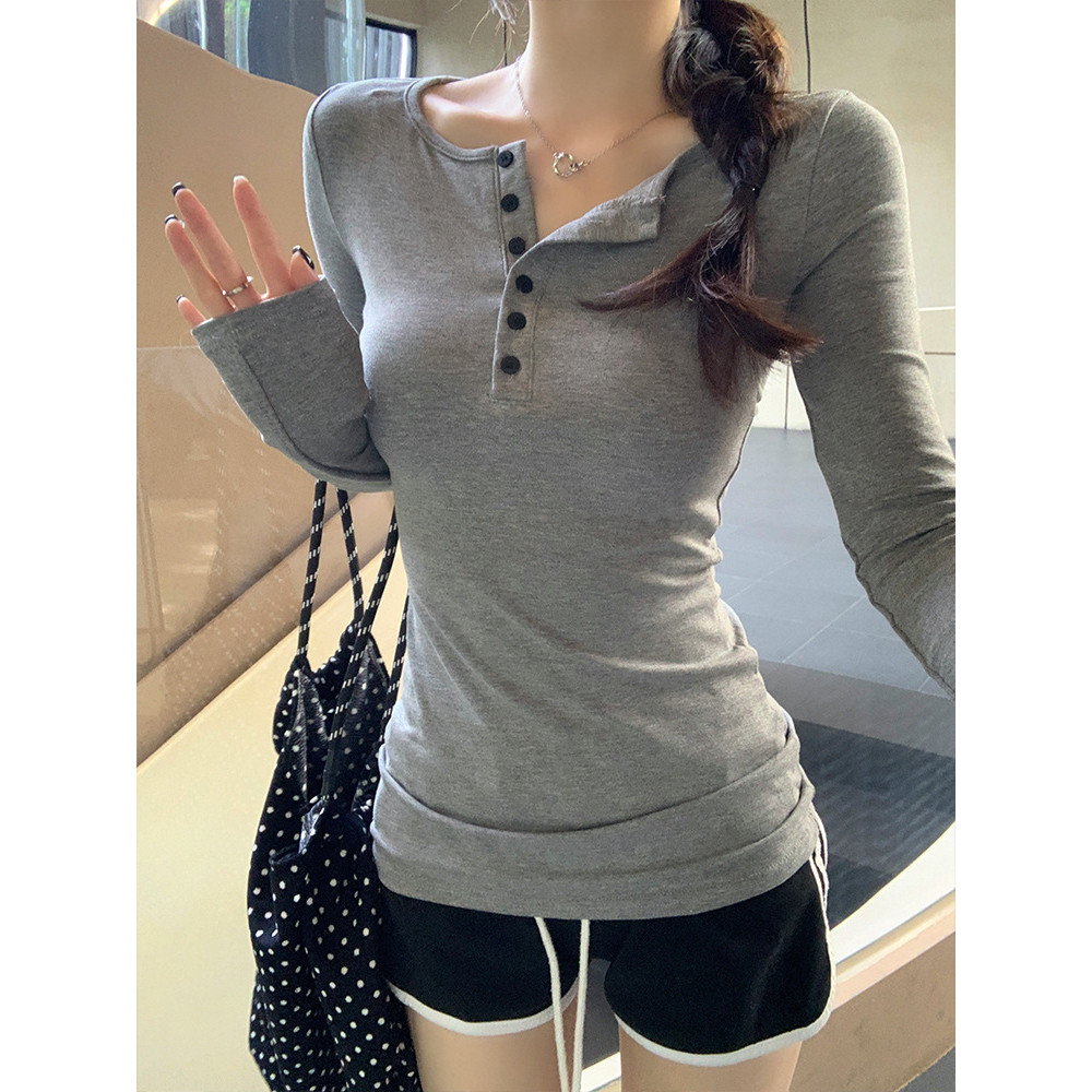 【WJZ】Women's Korean solid color slim fit fashionable button design long sleeve top【6960】