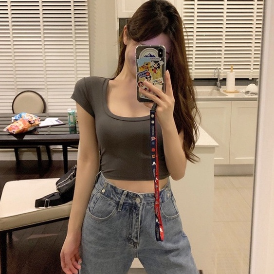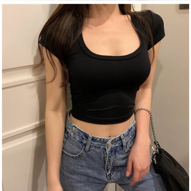 【WJZ】Women's Korean style U-neck solid color sexy short-sleeved T-shirt【6715】