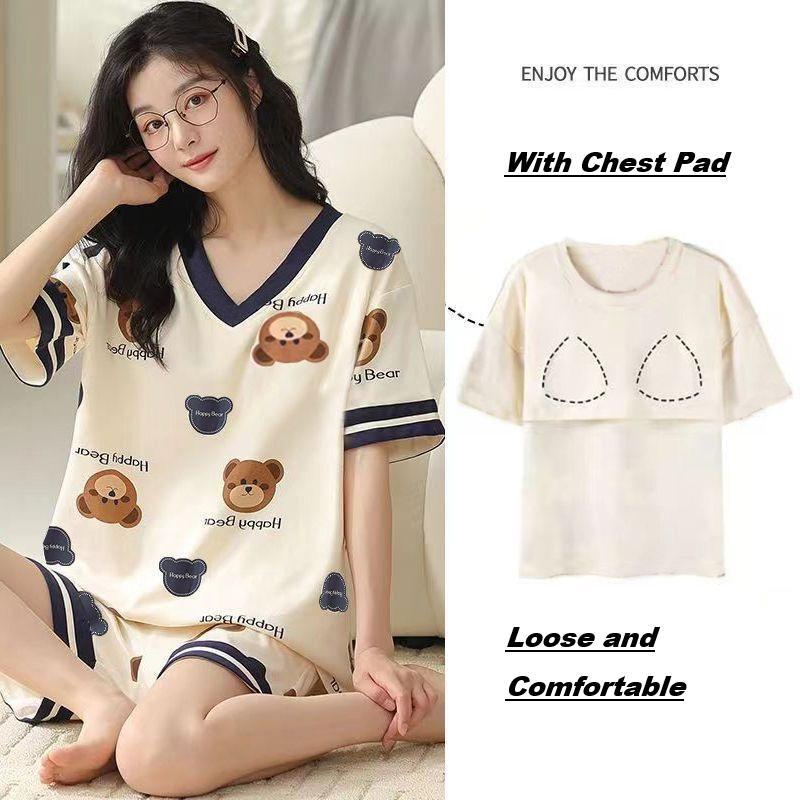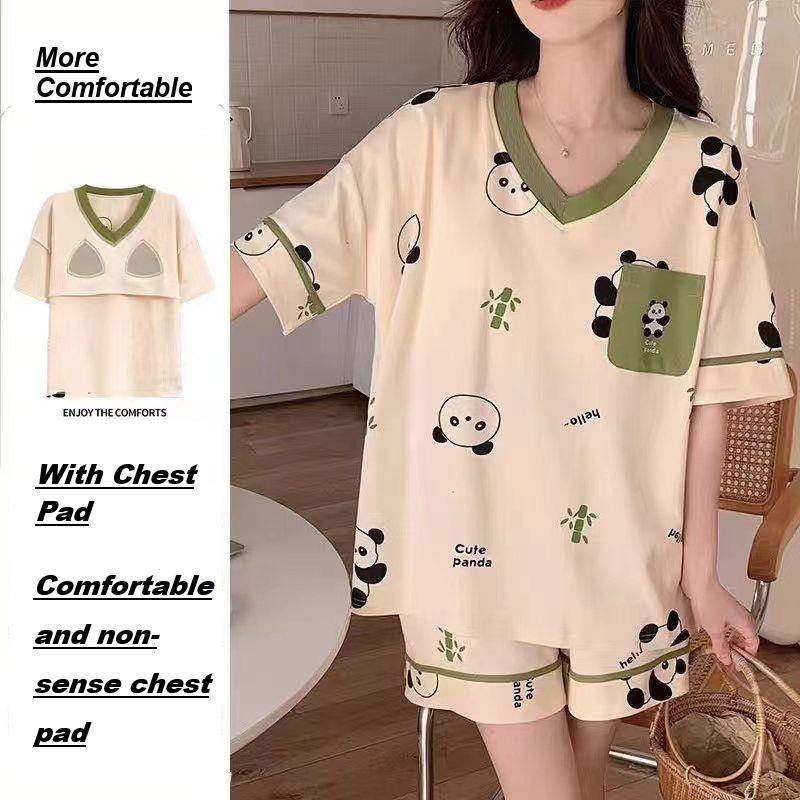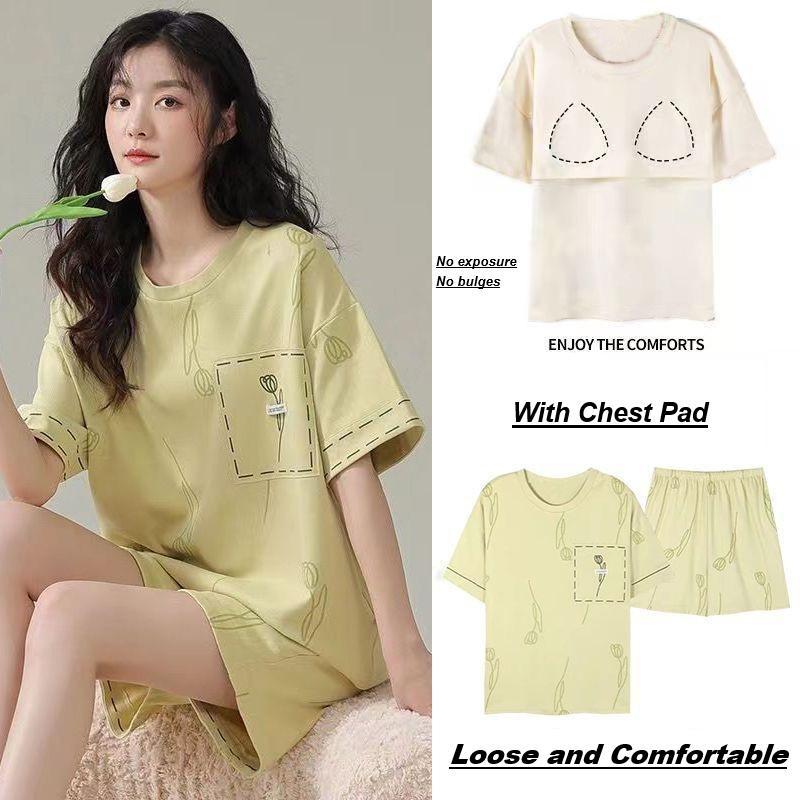 Woman Pajamas Cotton with Chest Pad Loose and Comfortable Sleepwear One Set Sleeve Shorts Set Baju Tidur Cotton [SW27]