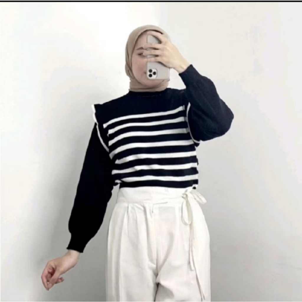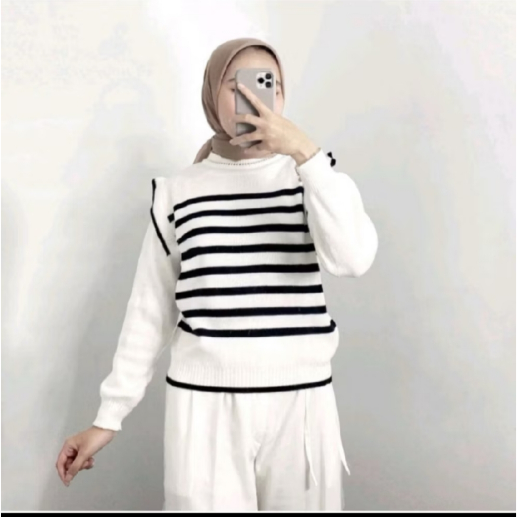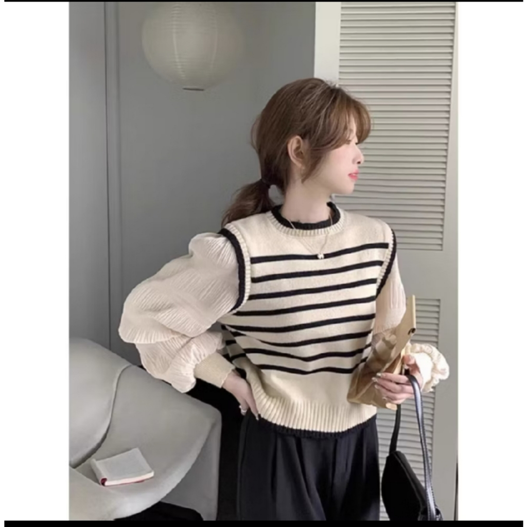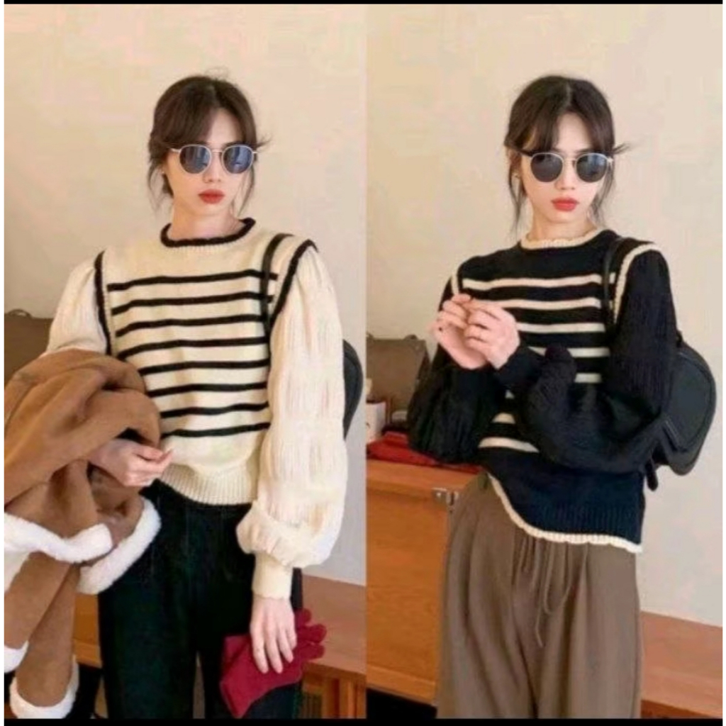Women's Balloon Sleeve Knit Top - Korean Style Striped Knit Sweater