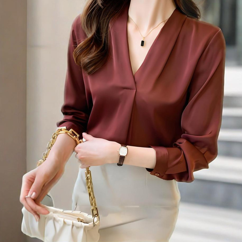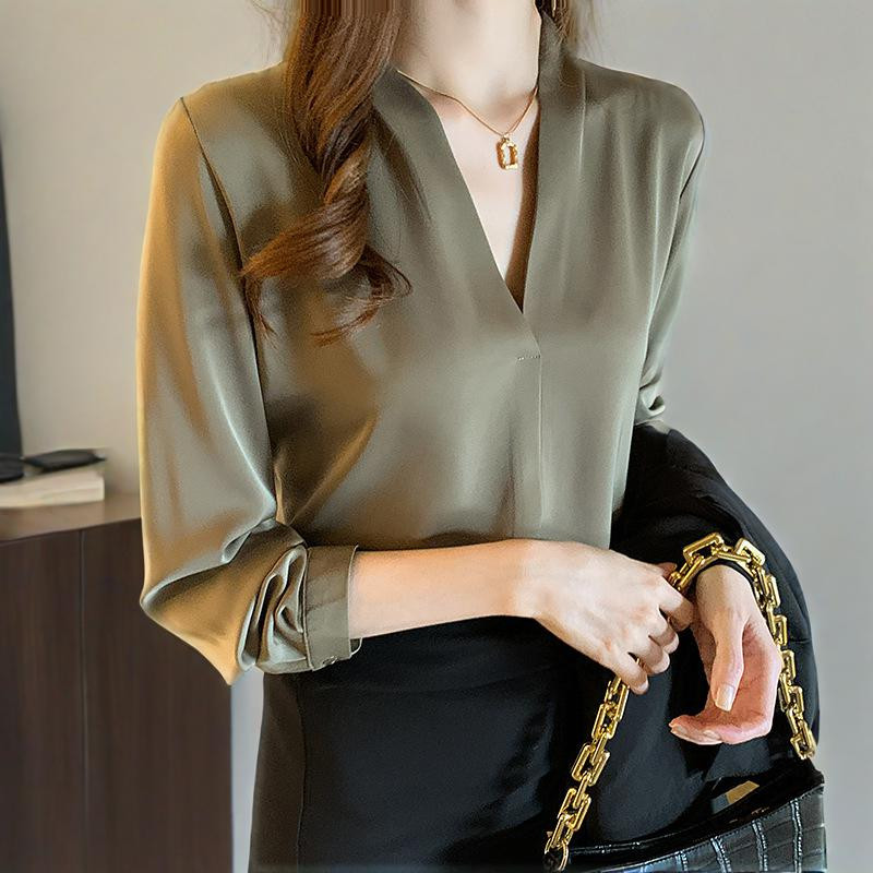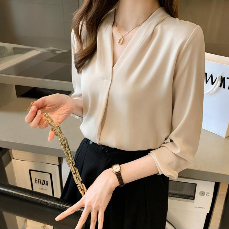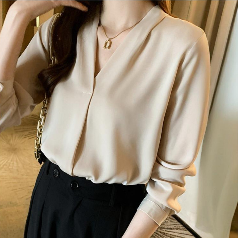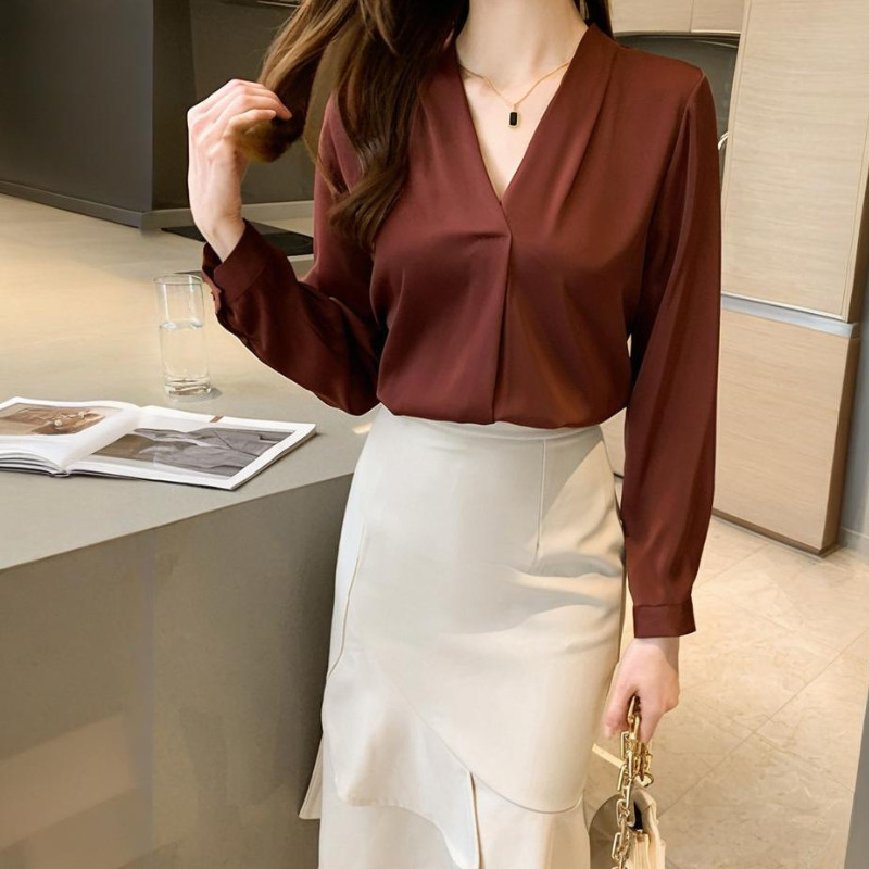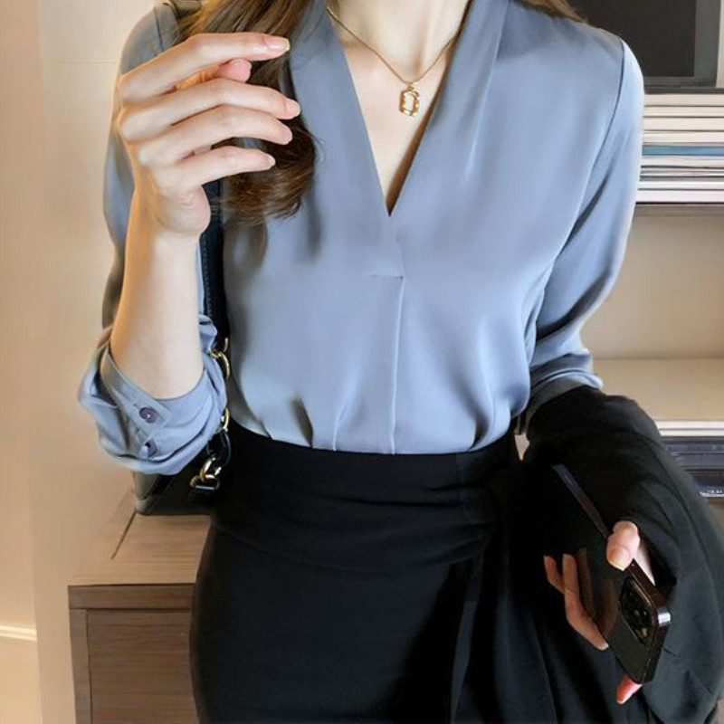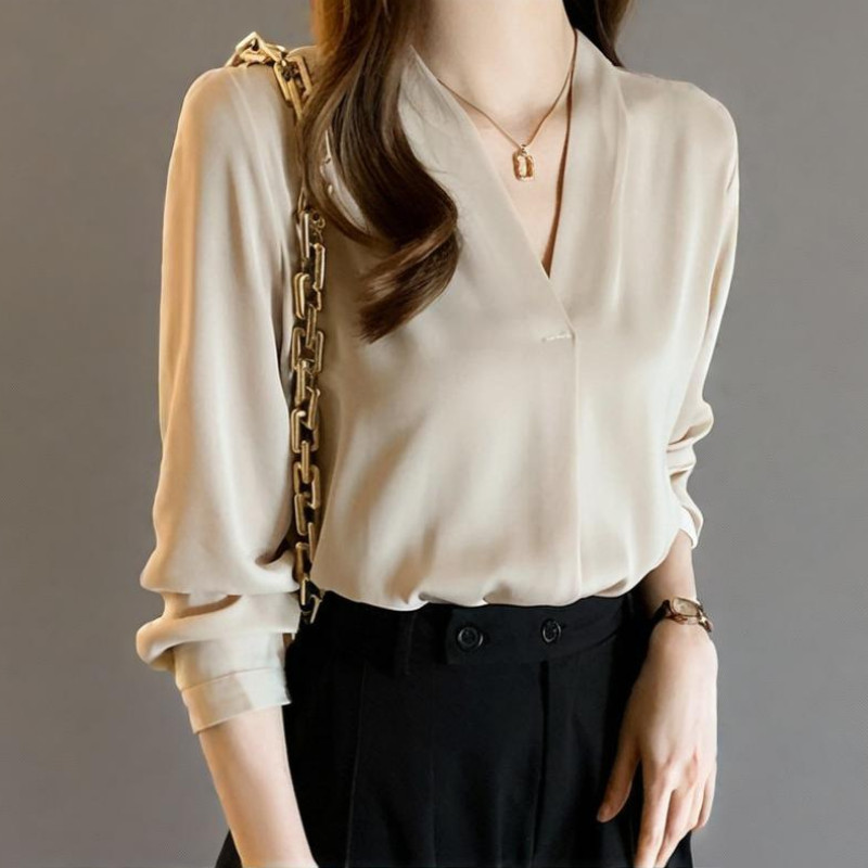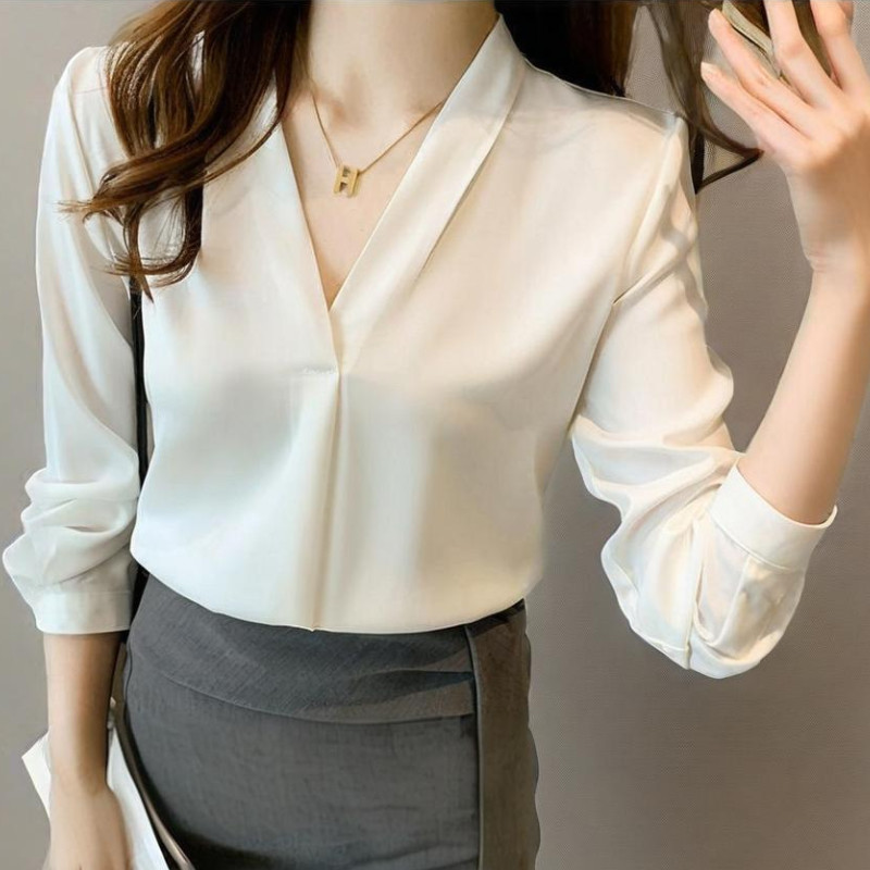 Women’s Elegant V-Neck Long Sleeve Blouse – Korean Style Workwear Top, Solid Color Office Shirt