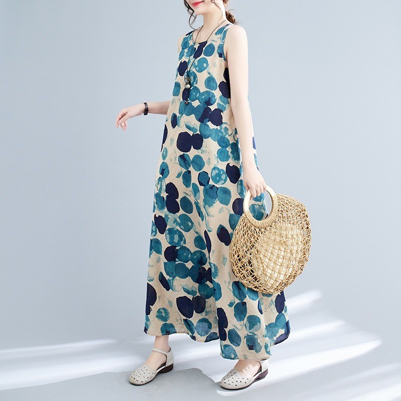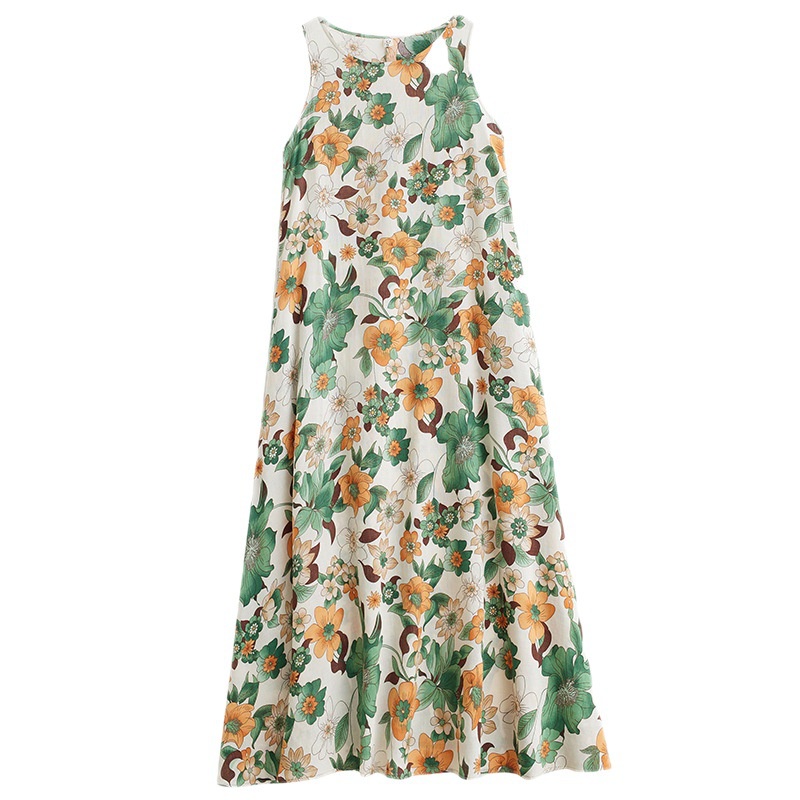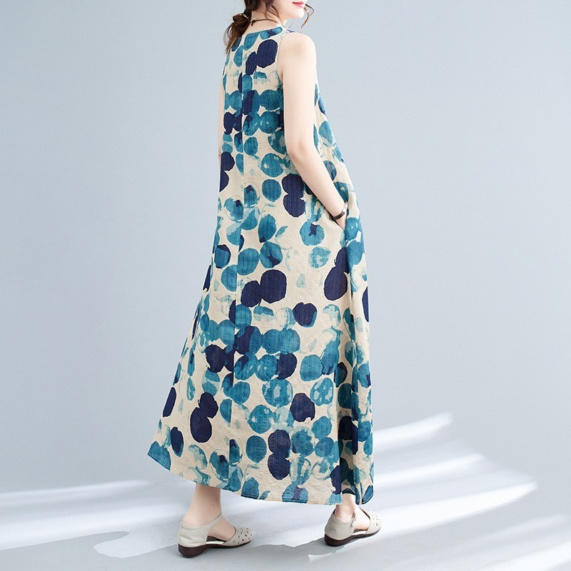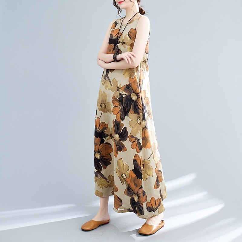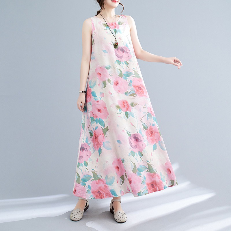 Women's Floral Summer Sun Dress Sleeveless Flowy Maxi Dresses Cotton Linen Floral Printed Casual Loose Beach Long Swing Holiday Dress with Pockets