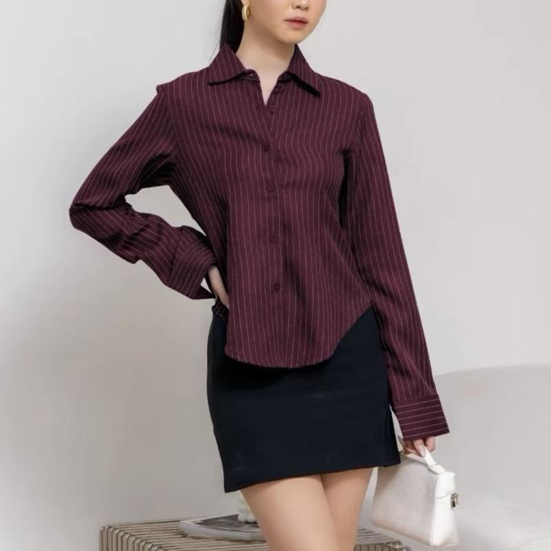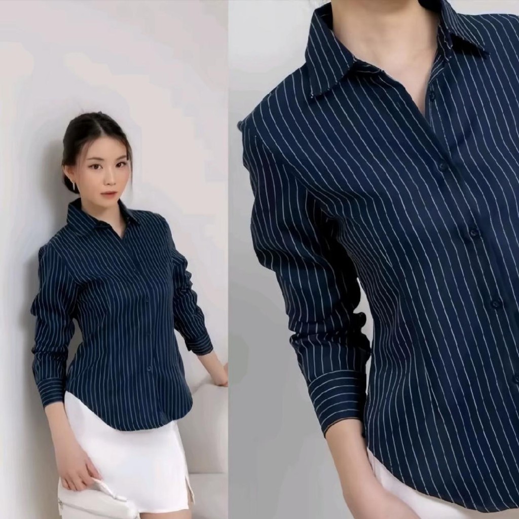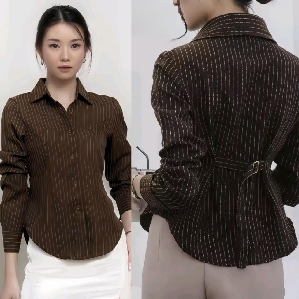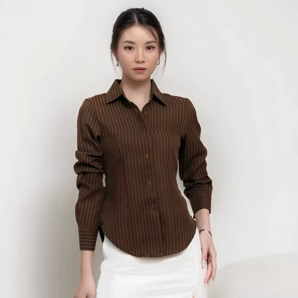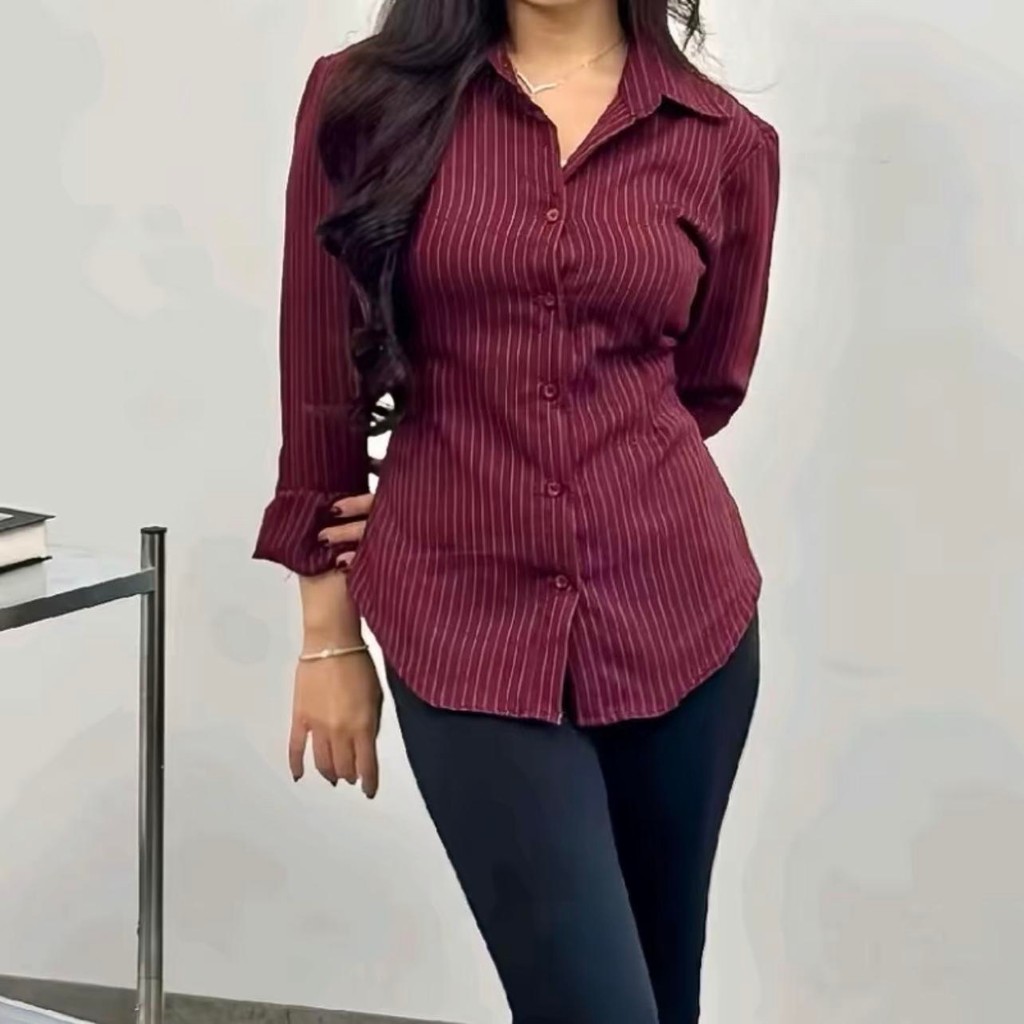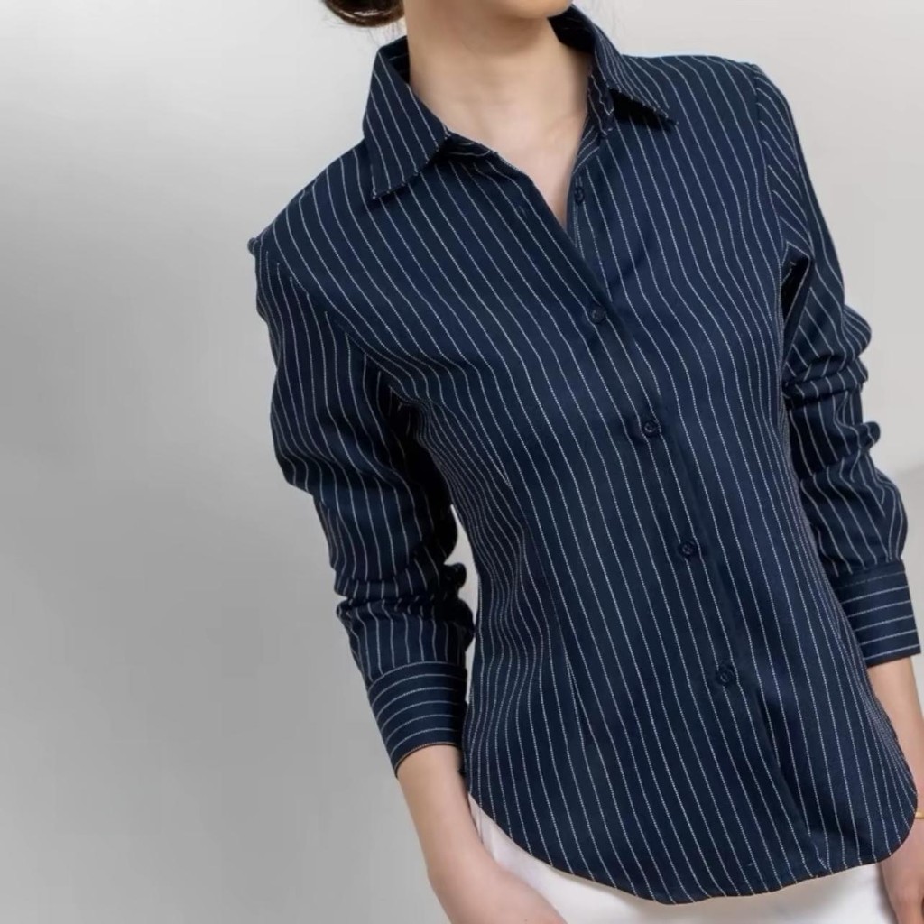 Women's Striped Long-Sleeved Cotton Shirt - Lapel Collar Button Down Elastic Waist Slim Fit