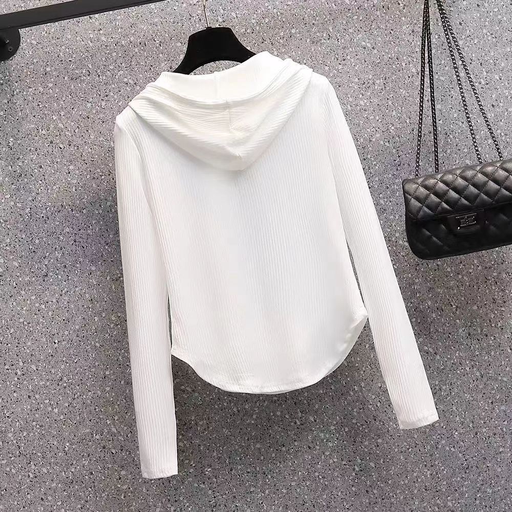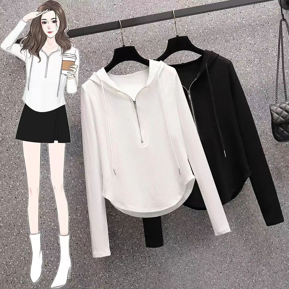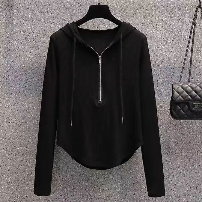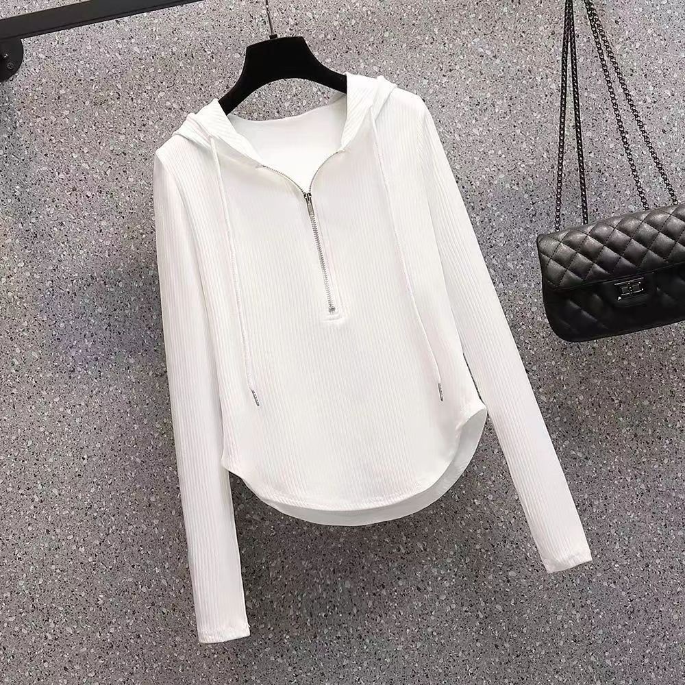 Women's Thread Elastic Zipper Hooded T-shirt New Solid Irregular Slim Fit Long Sleeve Underlay Fashion Casual Top