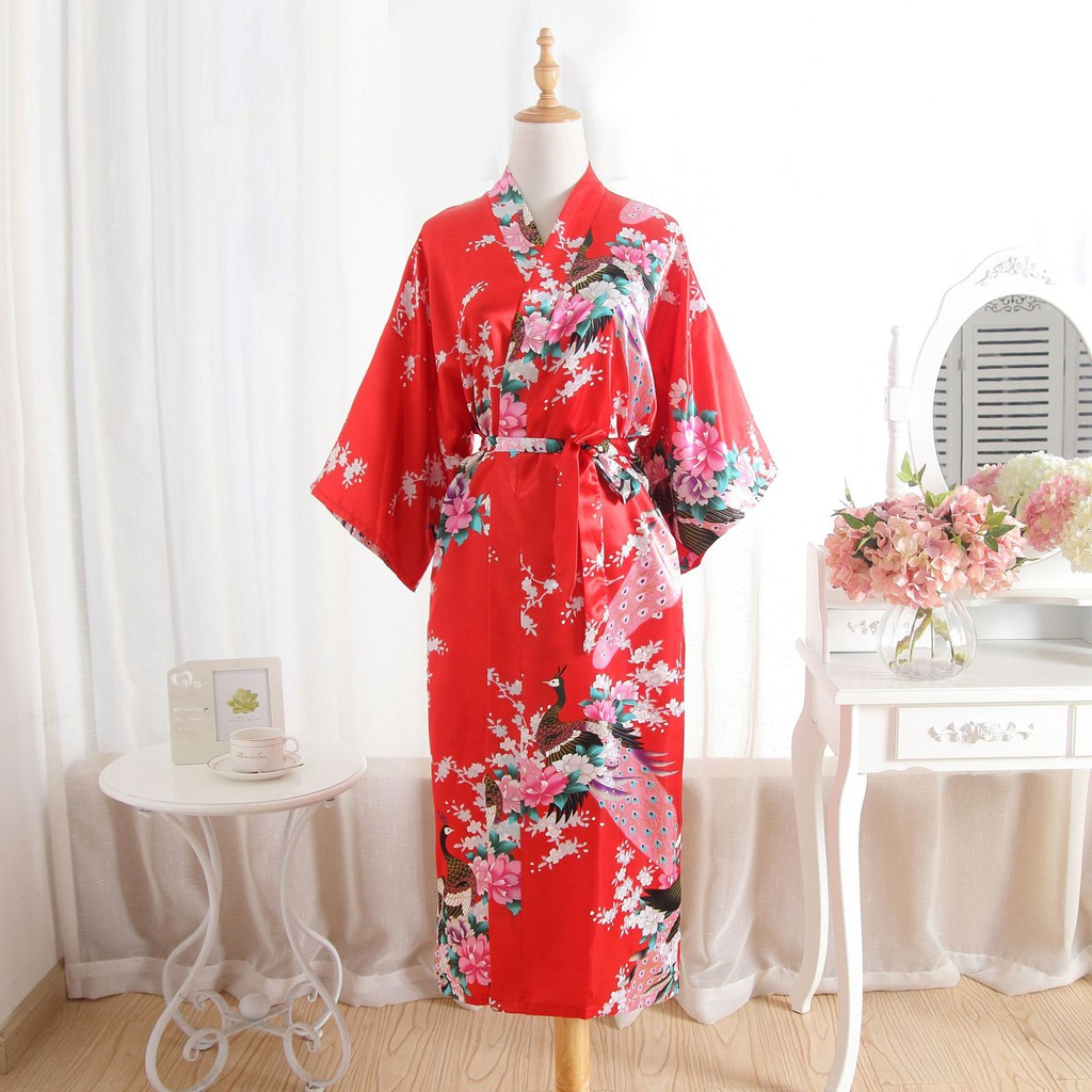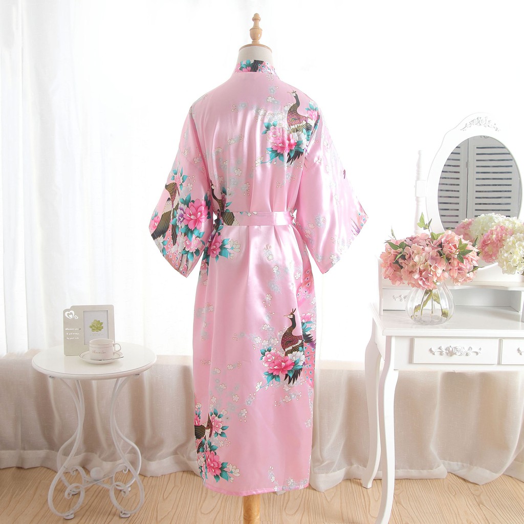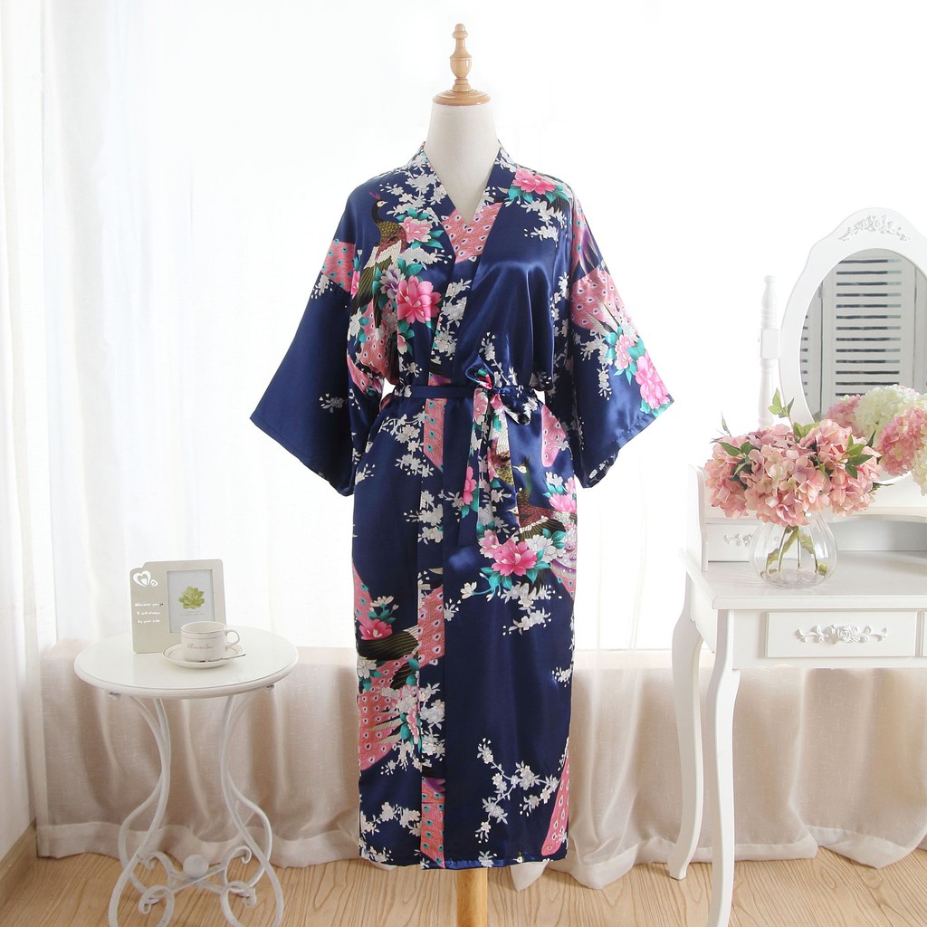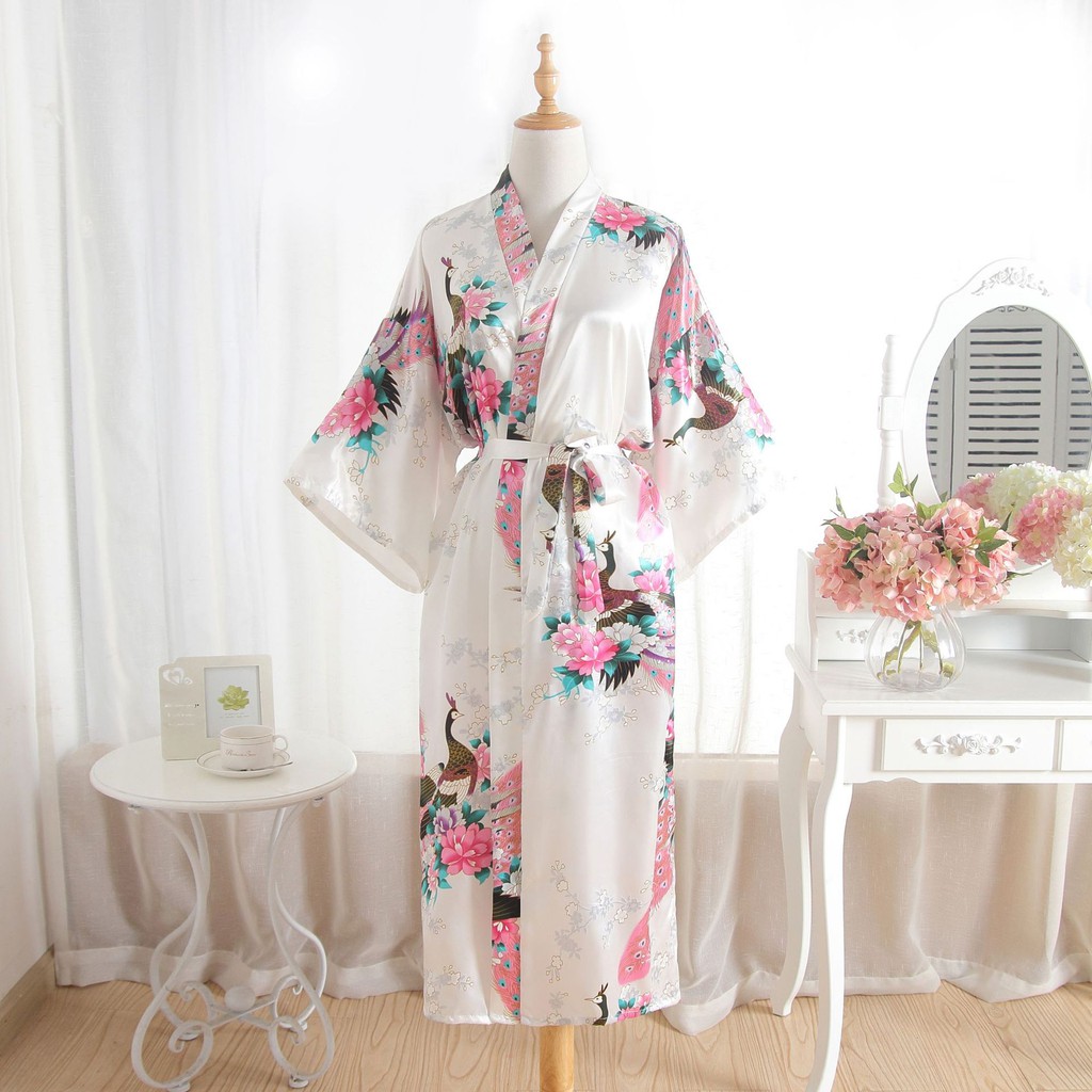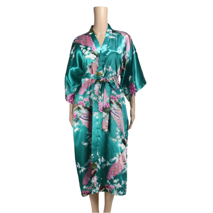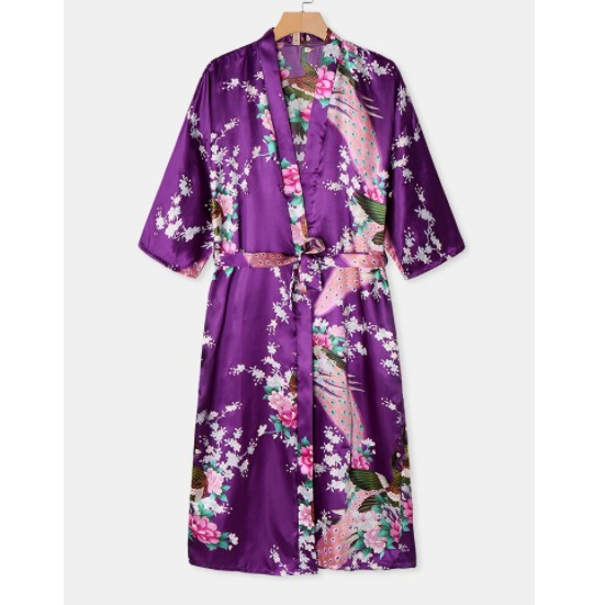 Women Sleepwear Satin Robe Floral Peacock Print Bathrobe Kimono Night Dressing 2 size