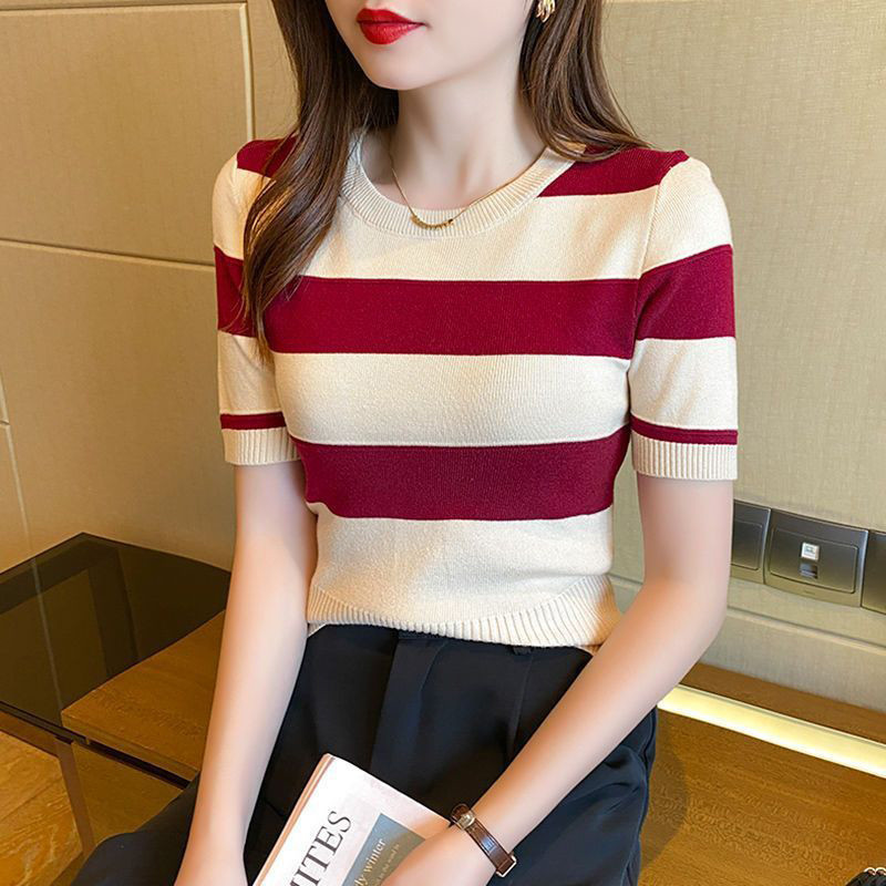 Women Slim Fitting Knitwear Korean Version Thin Striped Short Sleeve Short Top【IllusoryBawei】