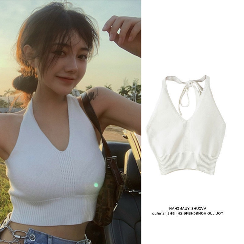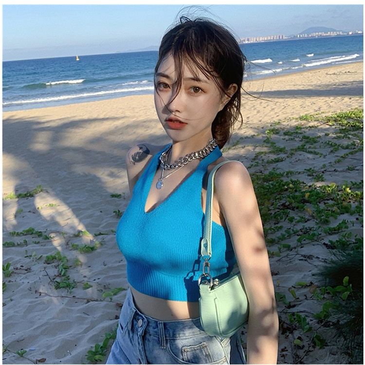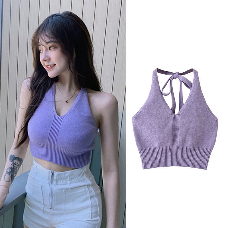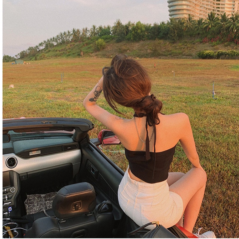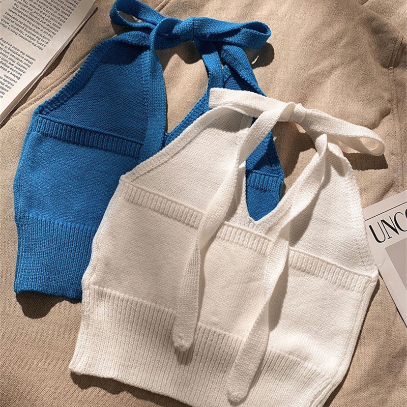 Women Summer Ins Halterneck Crop Tops Candy Color Hlaf Backless Camisole Lace Up Knit Tank Tops