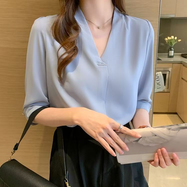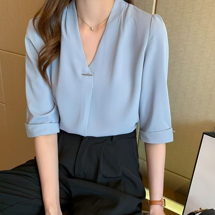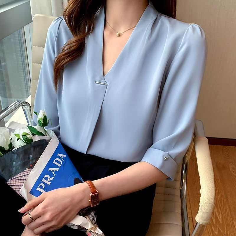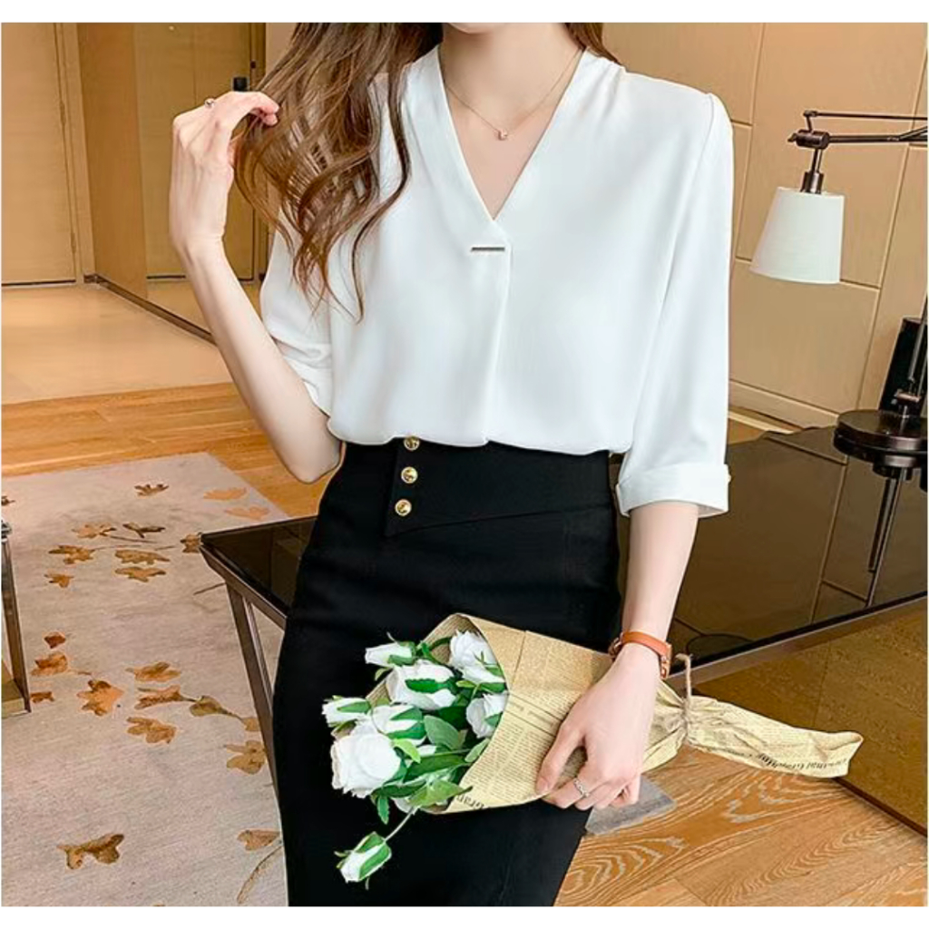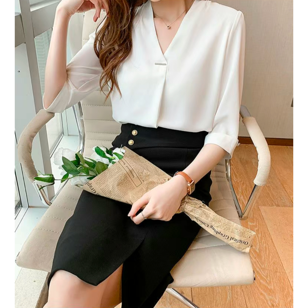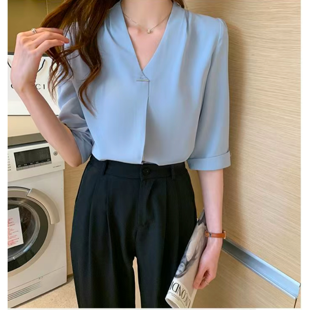 Women V-neck Blouse Chiffon Half Sleeve Pullover Elegant Office Baju Wanita Panjang