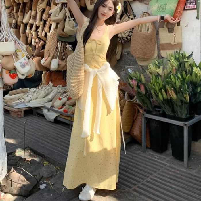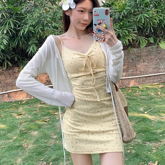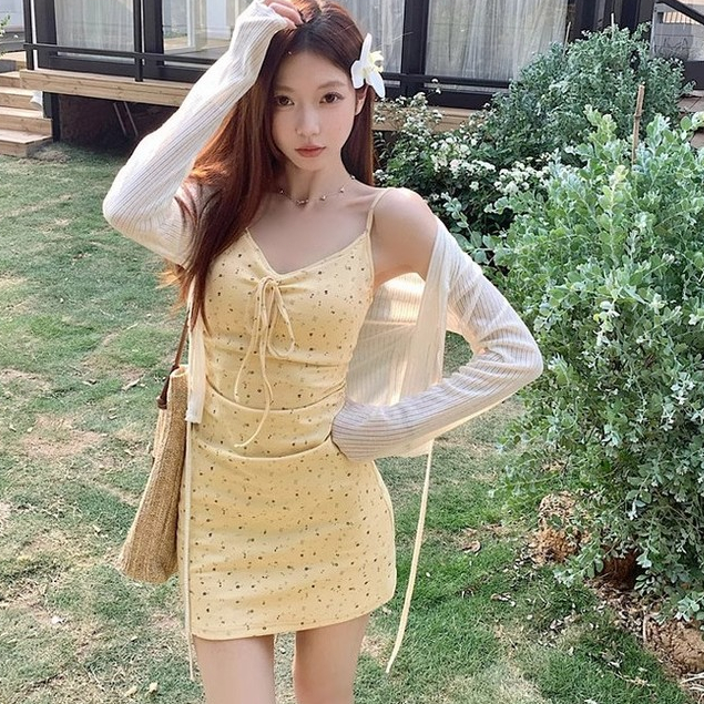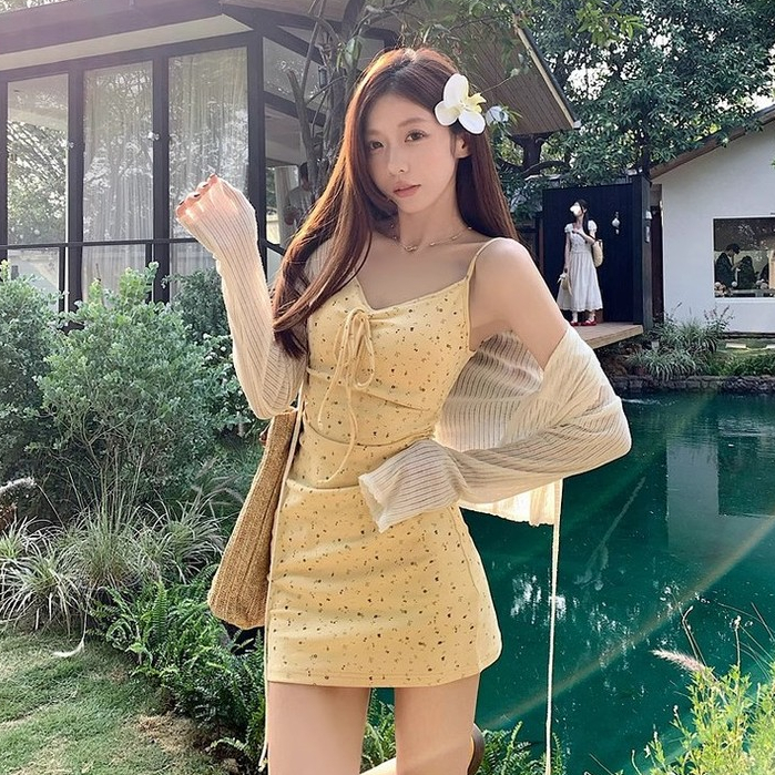Yellow Bow Floral Sling Dress Women Narrow Waist Skirt