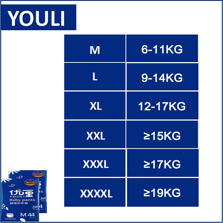 YOULI Premium Diapers - M (44 Pcs)/L (42 Pcs)/XL (40 Pcs)/XXL (36 Pcs)/XXXL (34 Pcs)/XXXXL (33 Pcs)/XXXXXL(32Pcs)