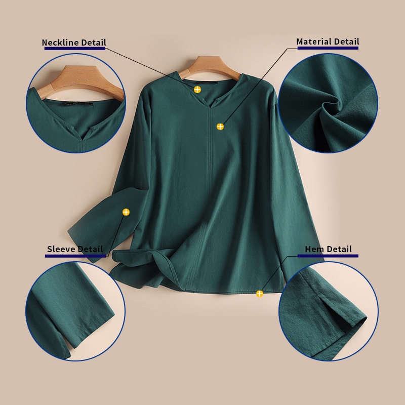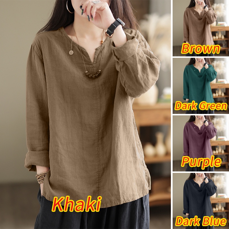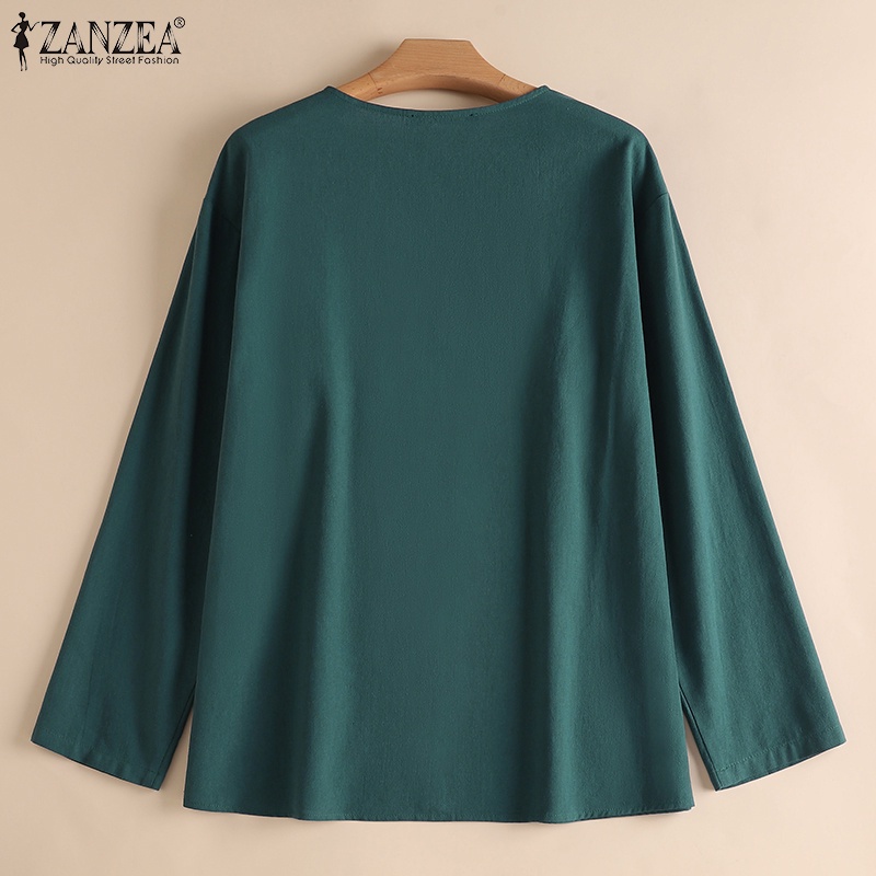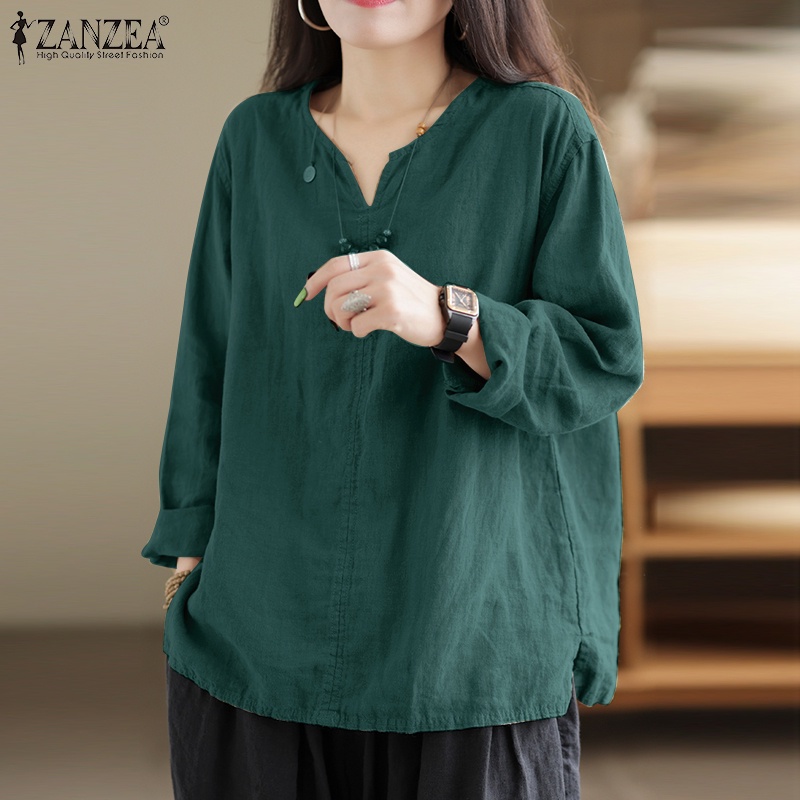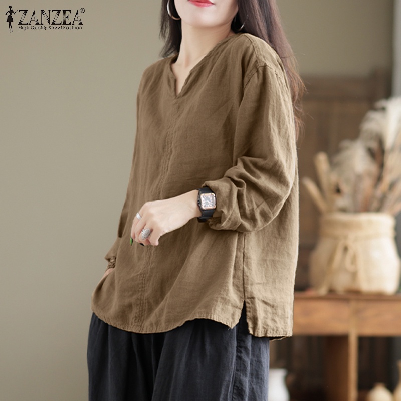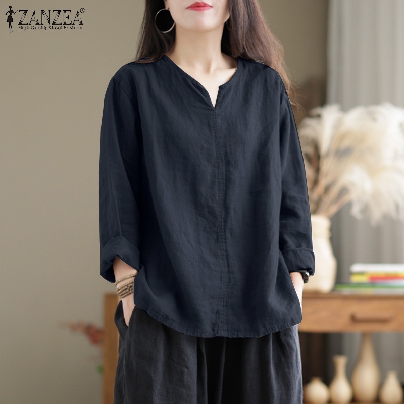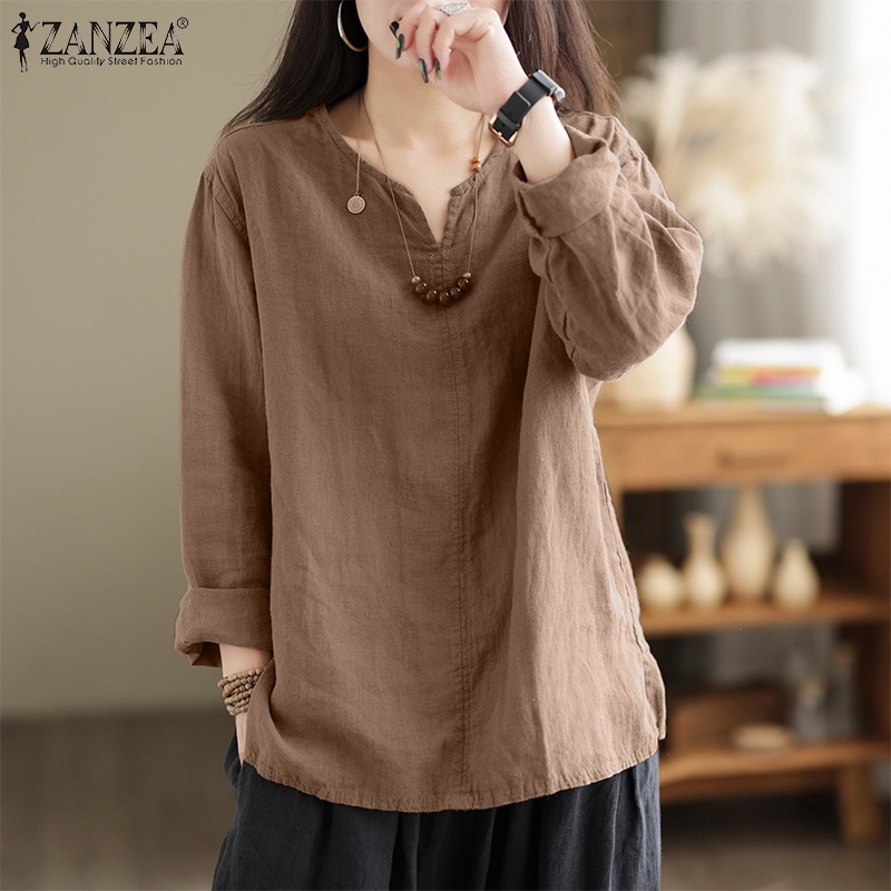 ZANZEA Women Casual Loose Long Sleeve V Neck Cotton Linen Plain Basic Tee Blouse