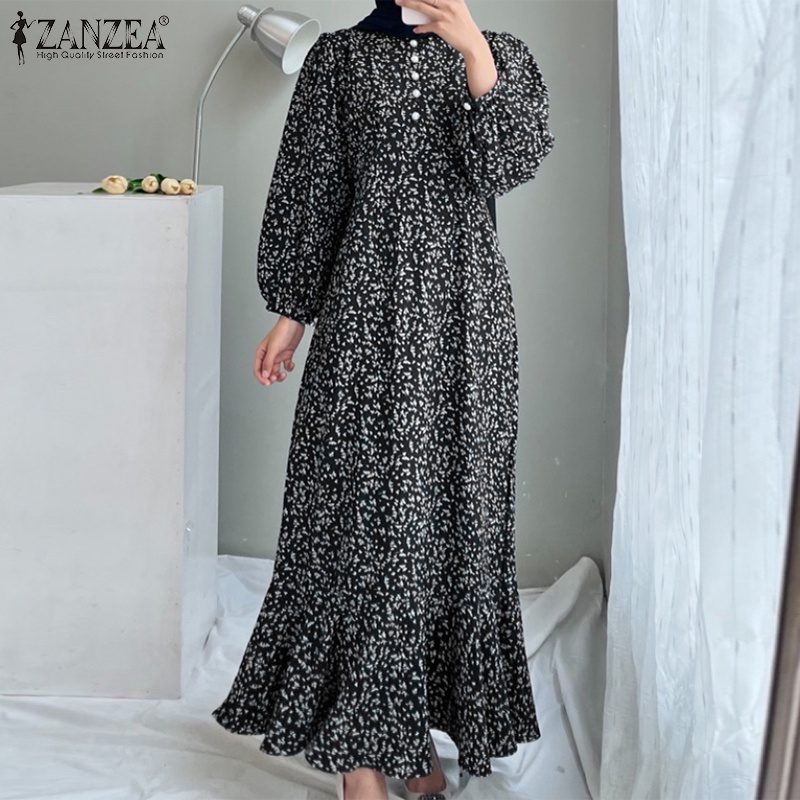 ZANZEA Women Casual Muslim Abaya Kaftan Full Sleeve O-Neck Front Buttons Back Zipper Slim Waist Floral Long Dress