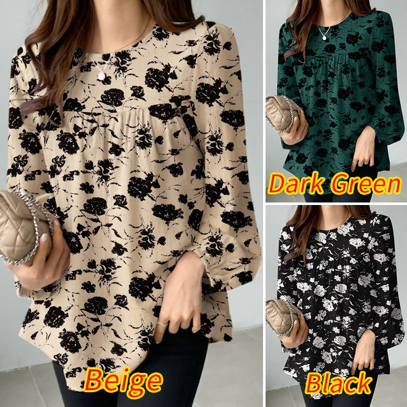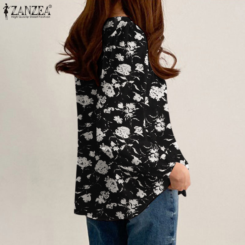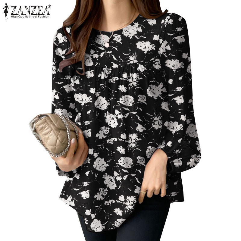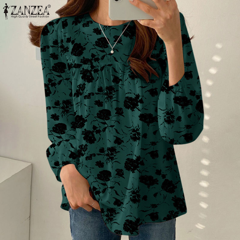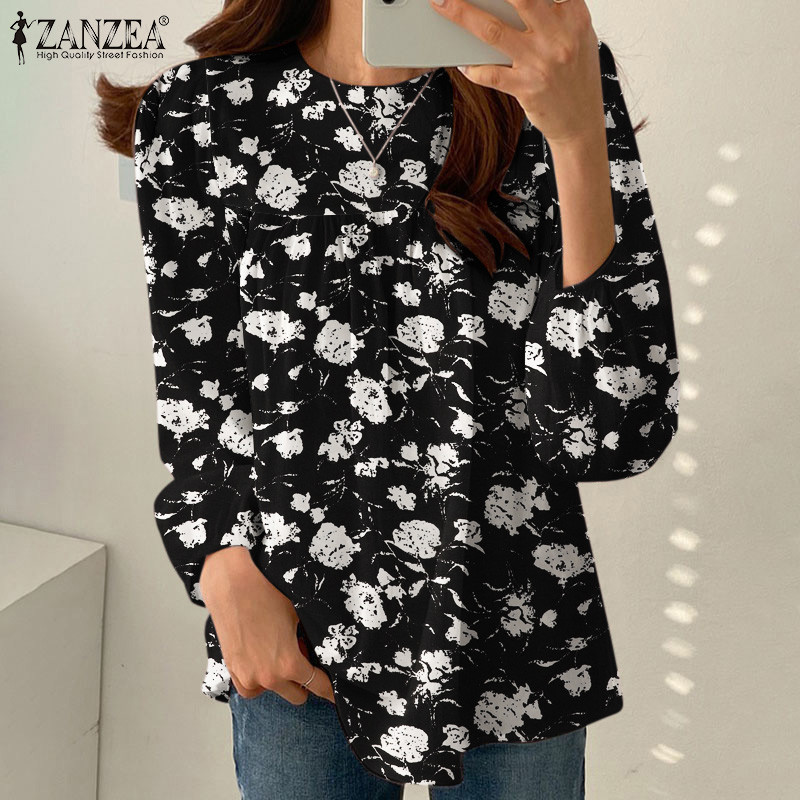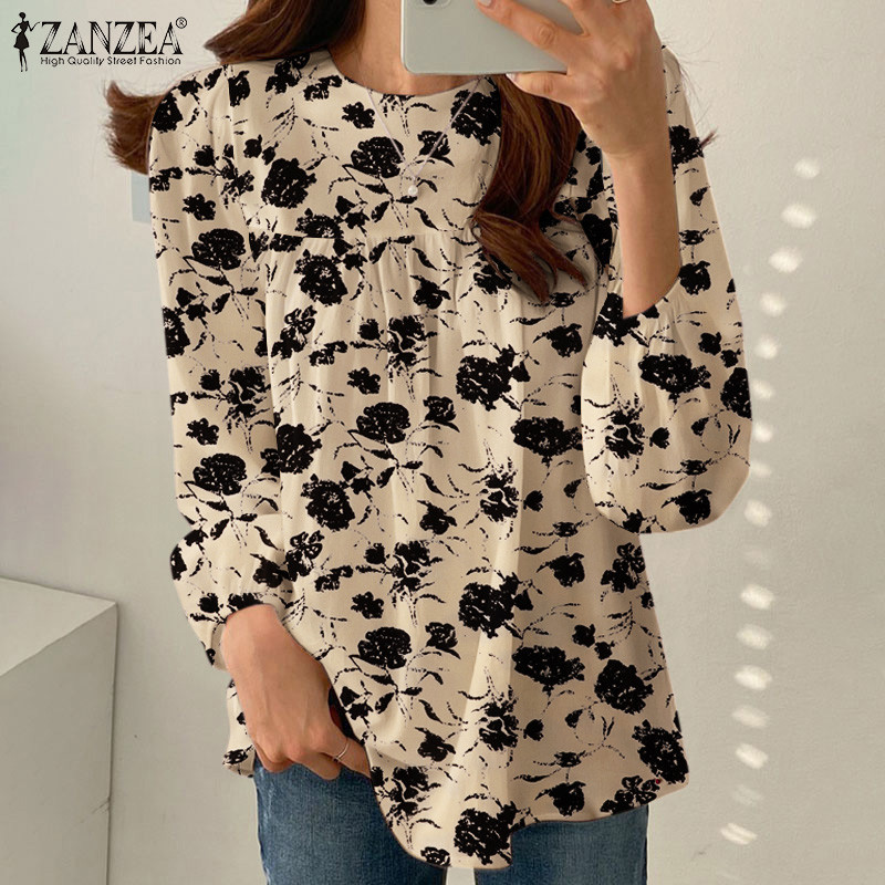 ZANZEA Women Korean Fashion Long Sleeve O-Neck Pleated Printed Blouse