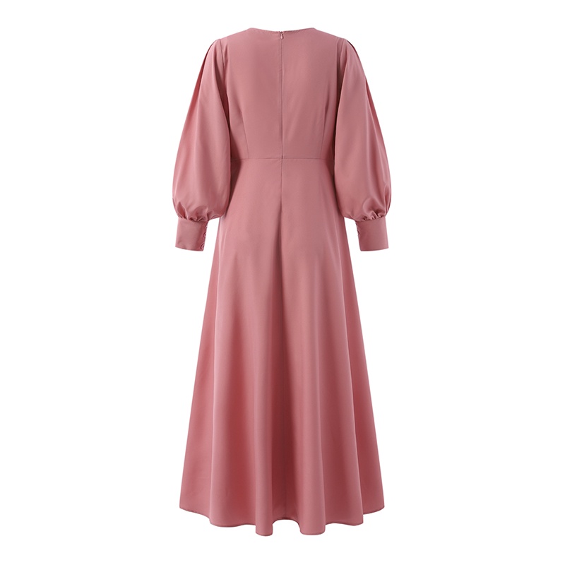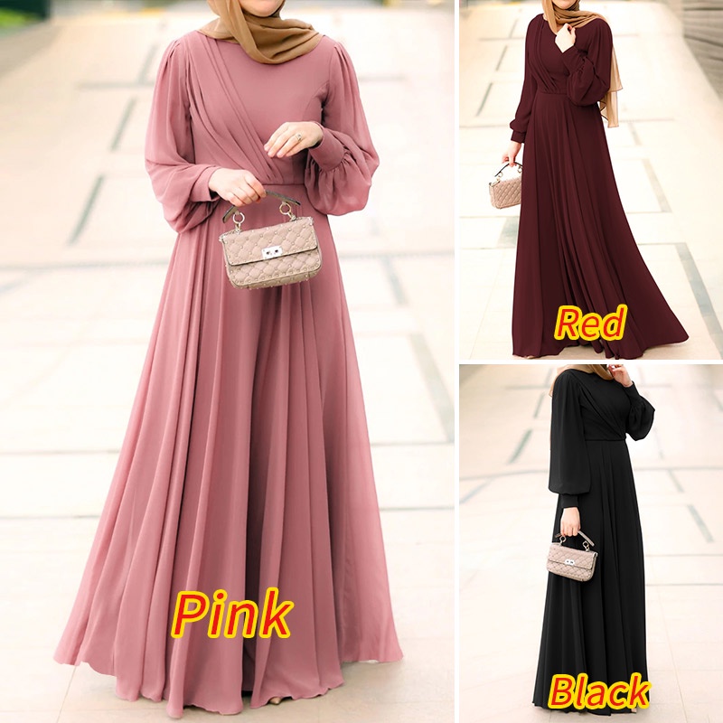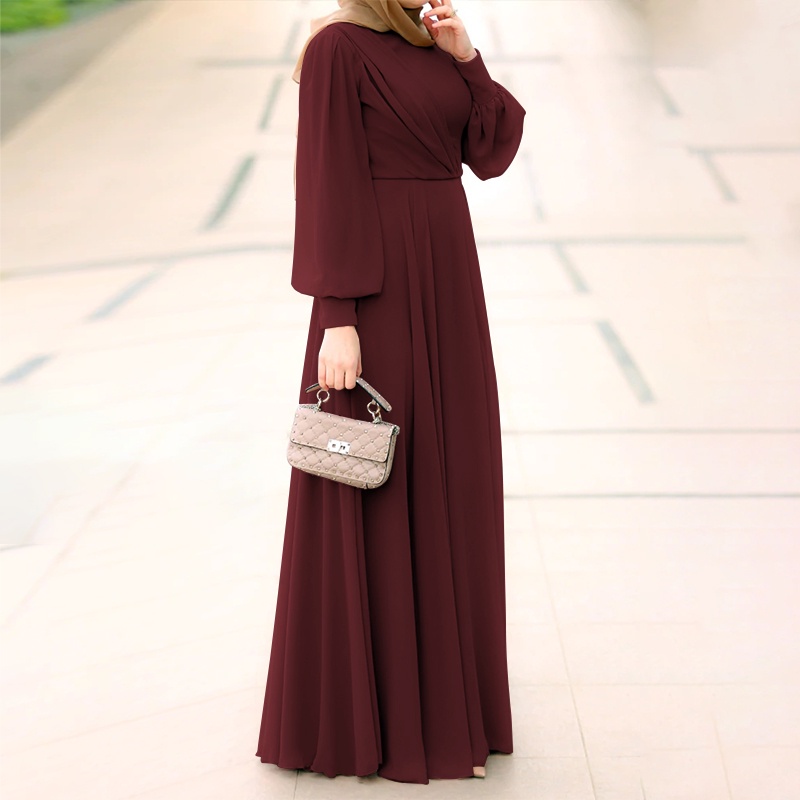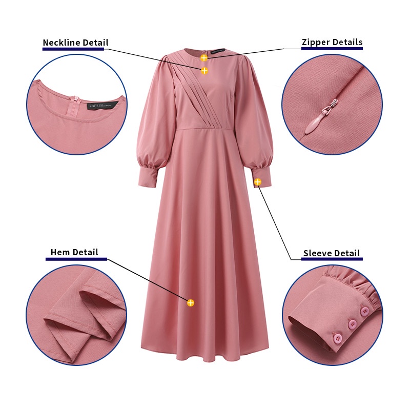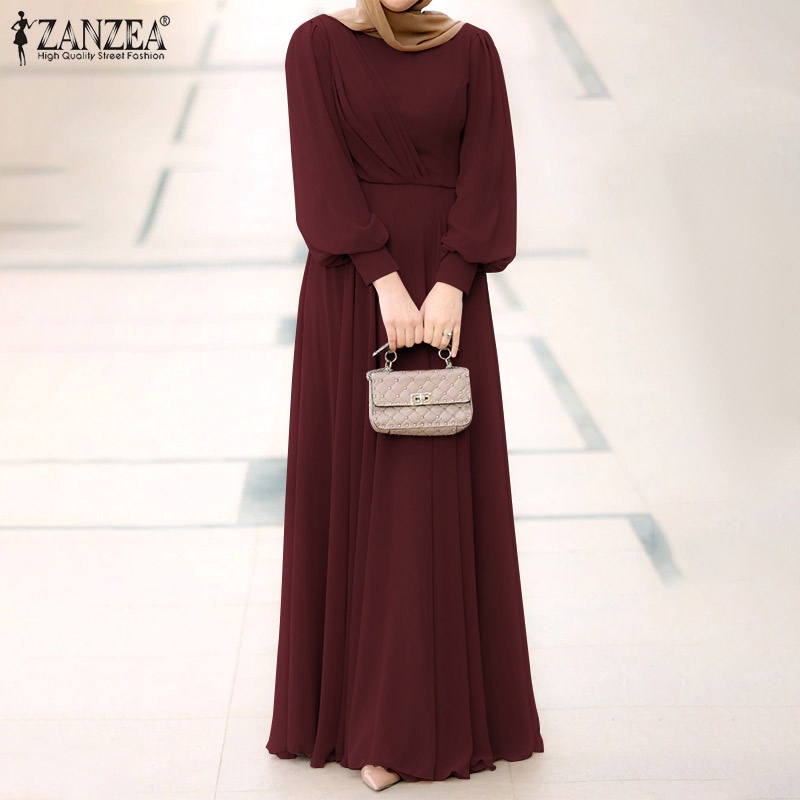 ZANZEA Women Long Puff Sleeve Casual Pleated Slim Waist Back Zipper Muslim Long Dress