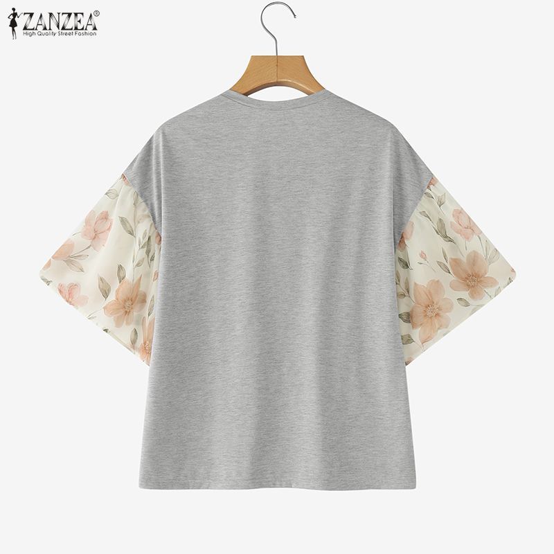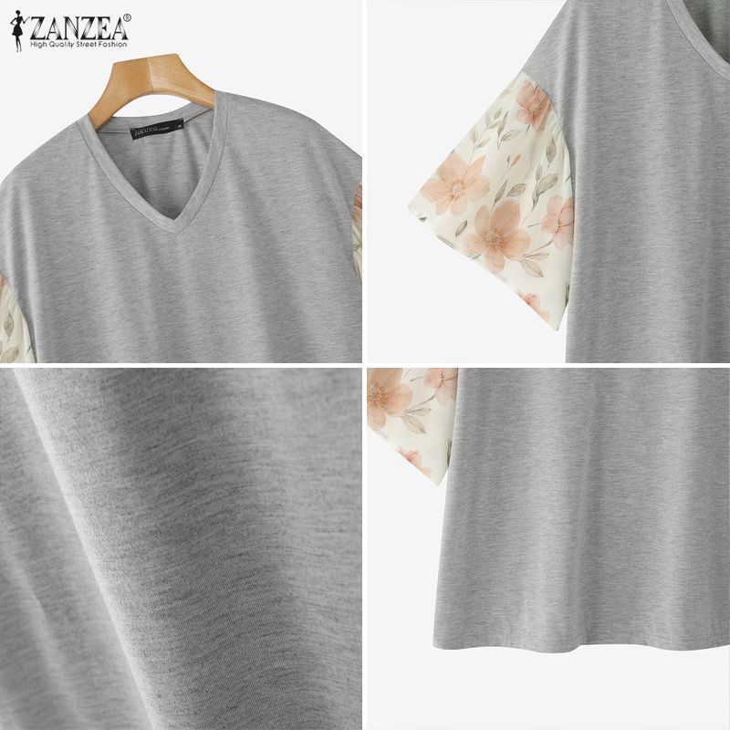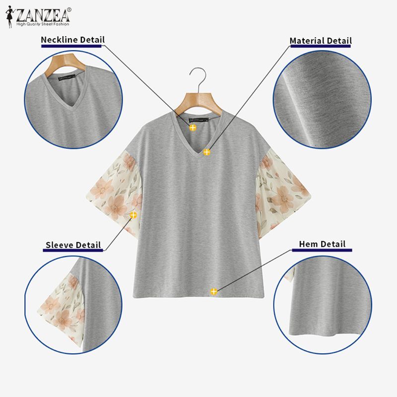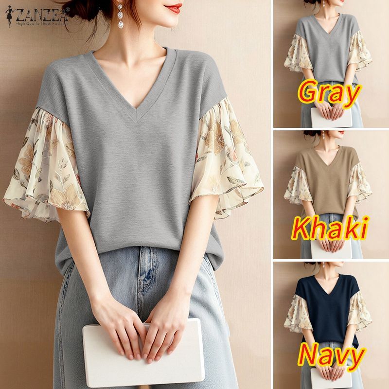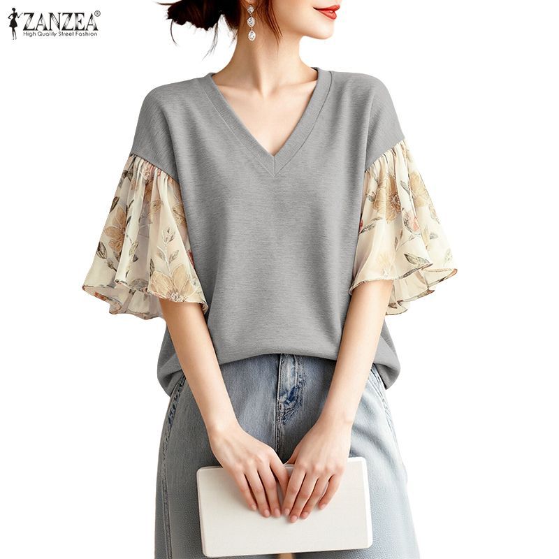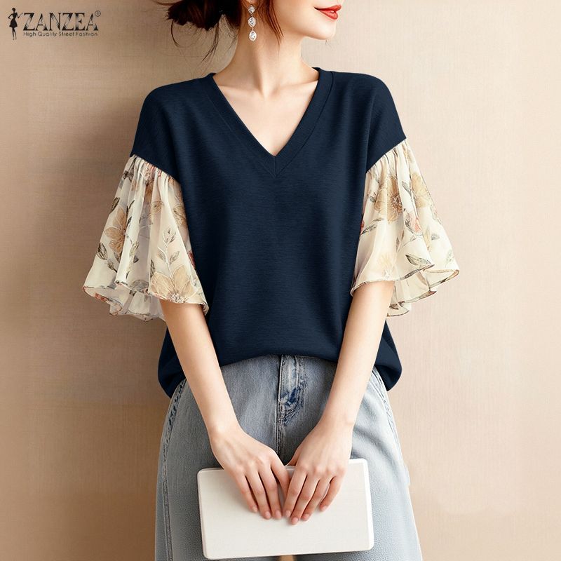 ZANZEA Women's V-Neck Ruffle Sleeve Blouse with Floral Prints and Contrast Colors