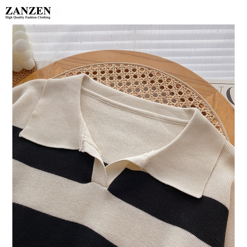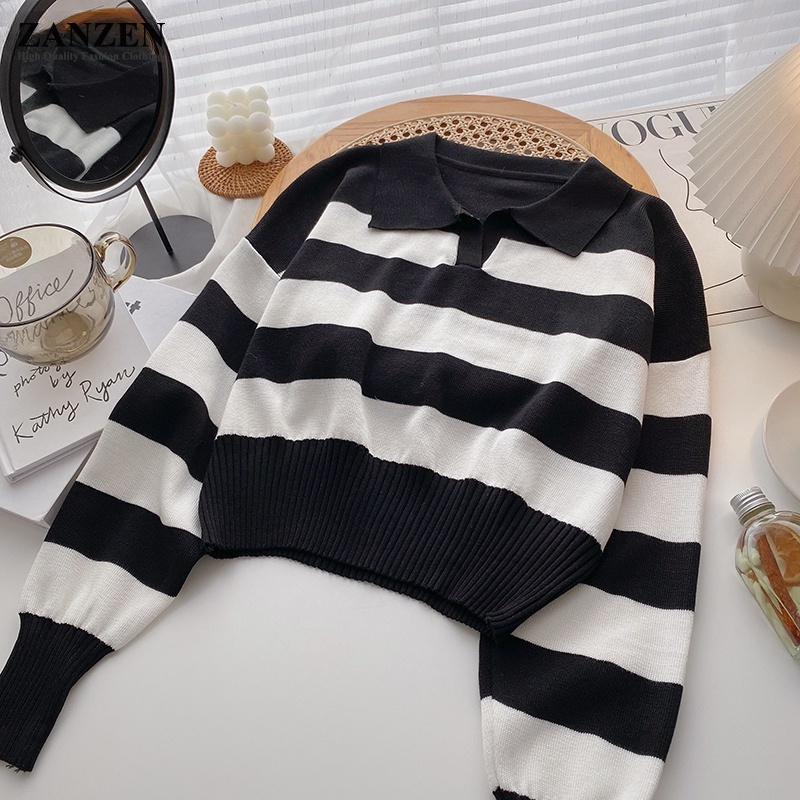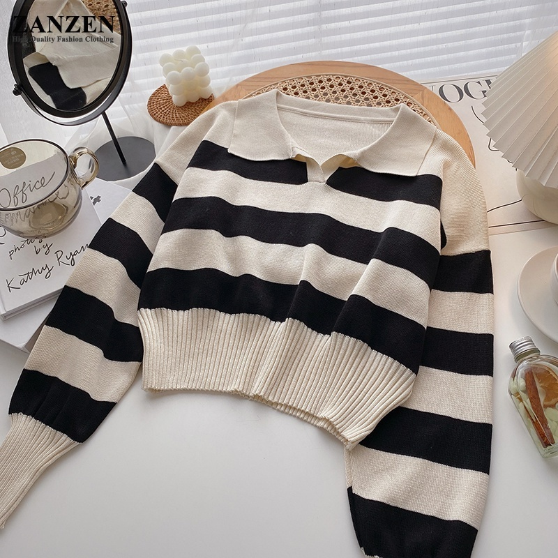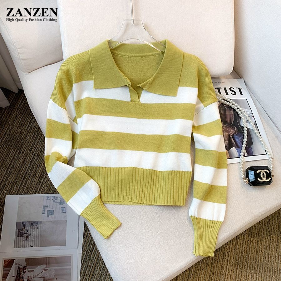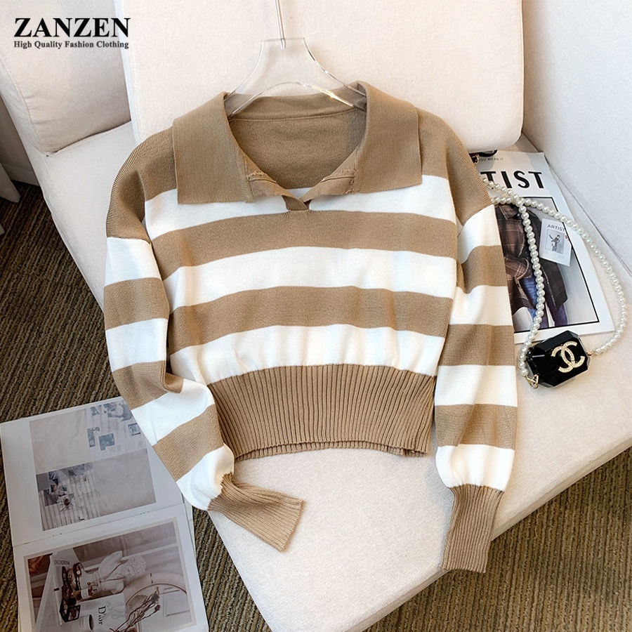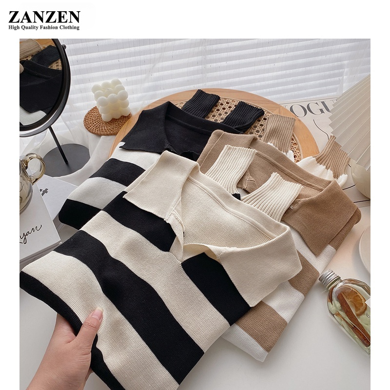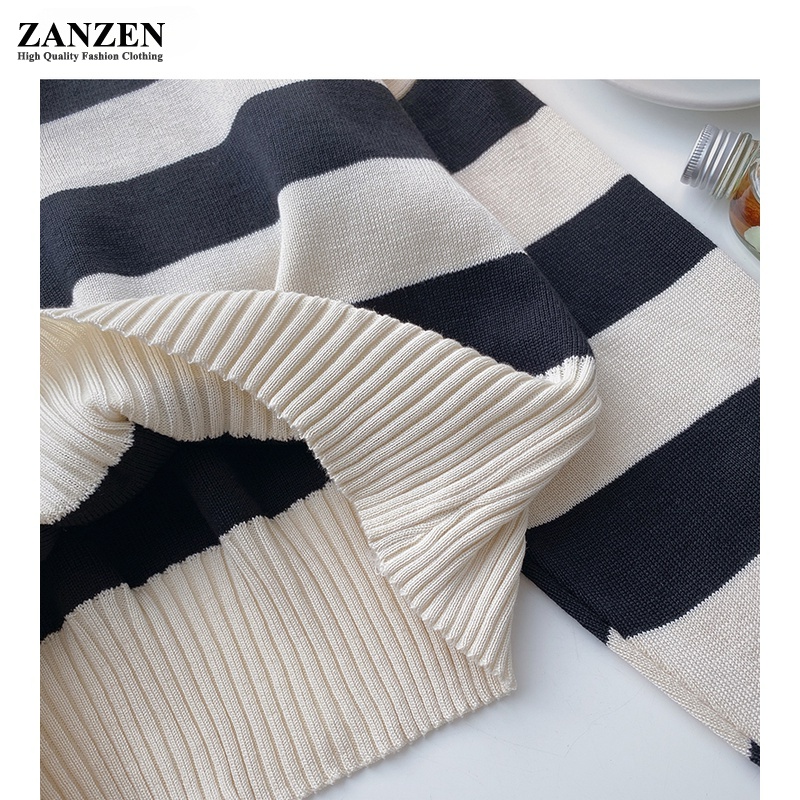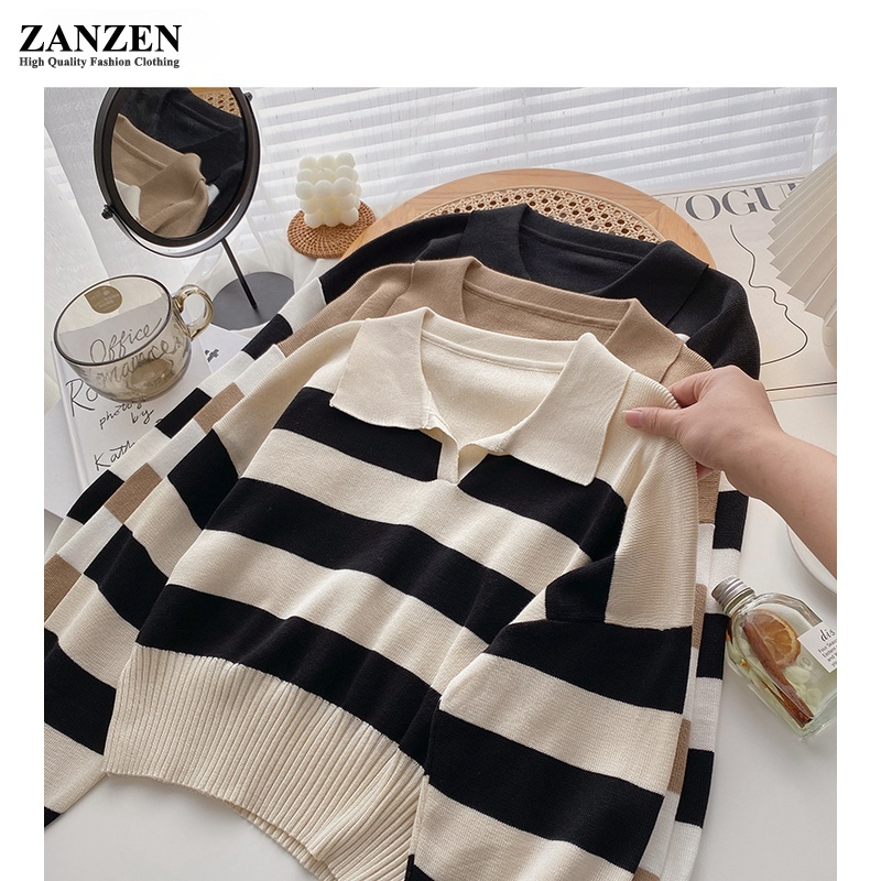 ZANZEN Korean Style Women Striped Knitted Women Ladies O-Neck Long Sleeve Knit Top Sweaters Shirts Loose Blouse