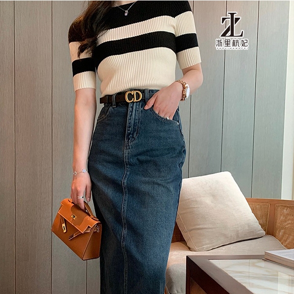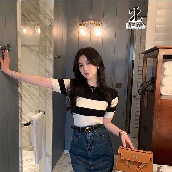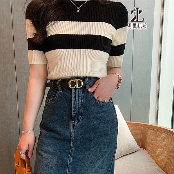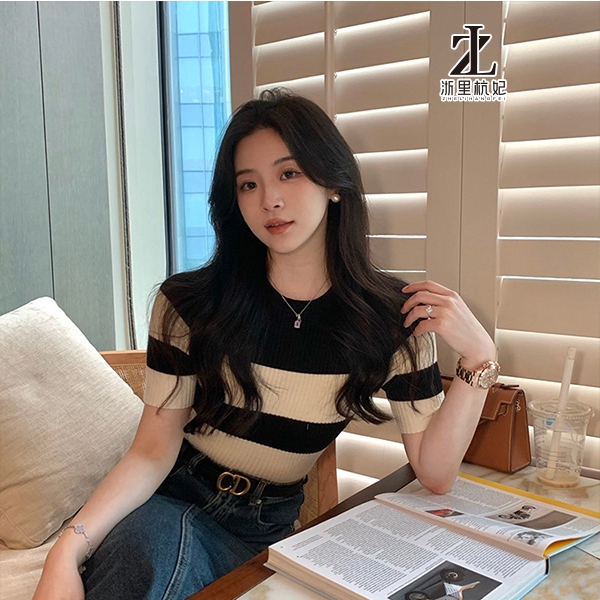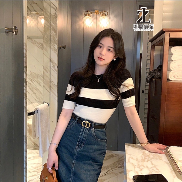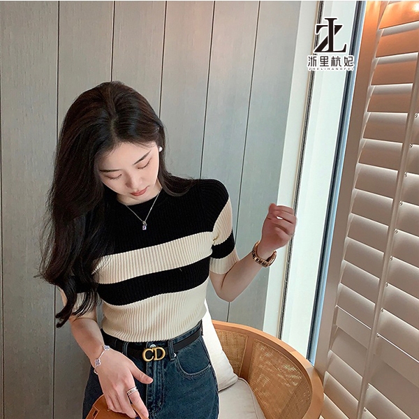 ZHELIHANGFEI Striped knitwear short-sleeved waisted temperament peplum tops