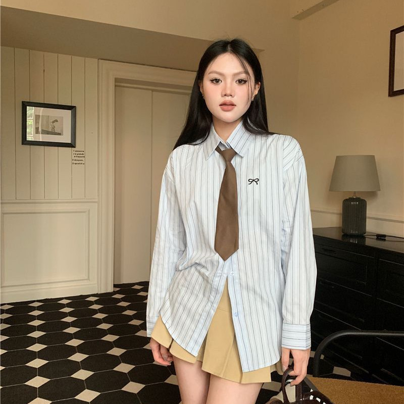 ?Zsndp? [Ready Stock In Malaysia] Blouse Women Baju Kemeja Perempuan Korean Style Striped Women Sweet Western Style Long-Sleeved Shirt Top