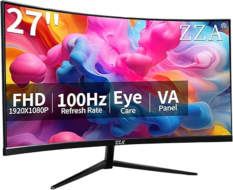 ZZA 27 inch 100Hz Curved Monitor with 1K 1920x1080 Computer Screen 27 inch FHD with HDMI,VGA and Wall Mountable|1080P Eye Care PC Office Display for Working and Gaming